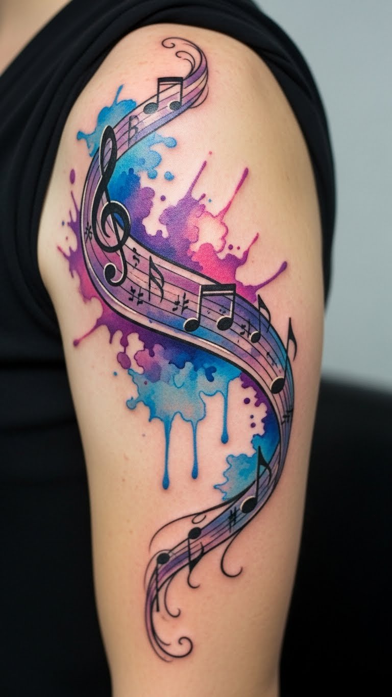 The upper arm melody tattoo symbolizes the wearer’s profound connection to music, representing their life’s rhythm and personal journey.