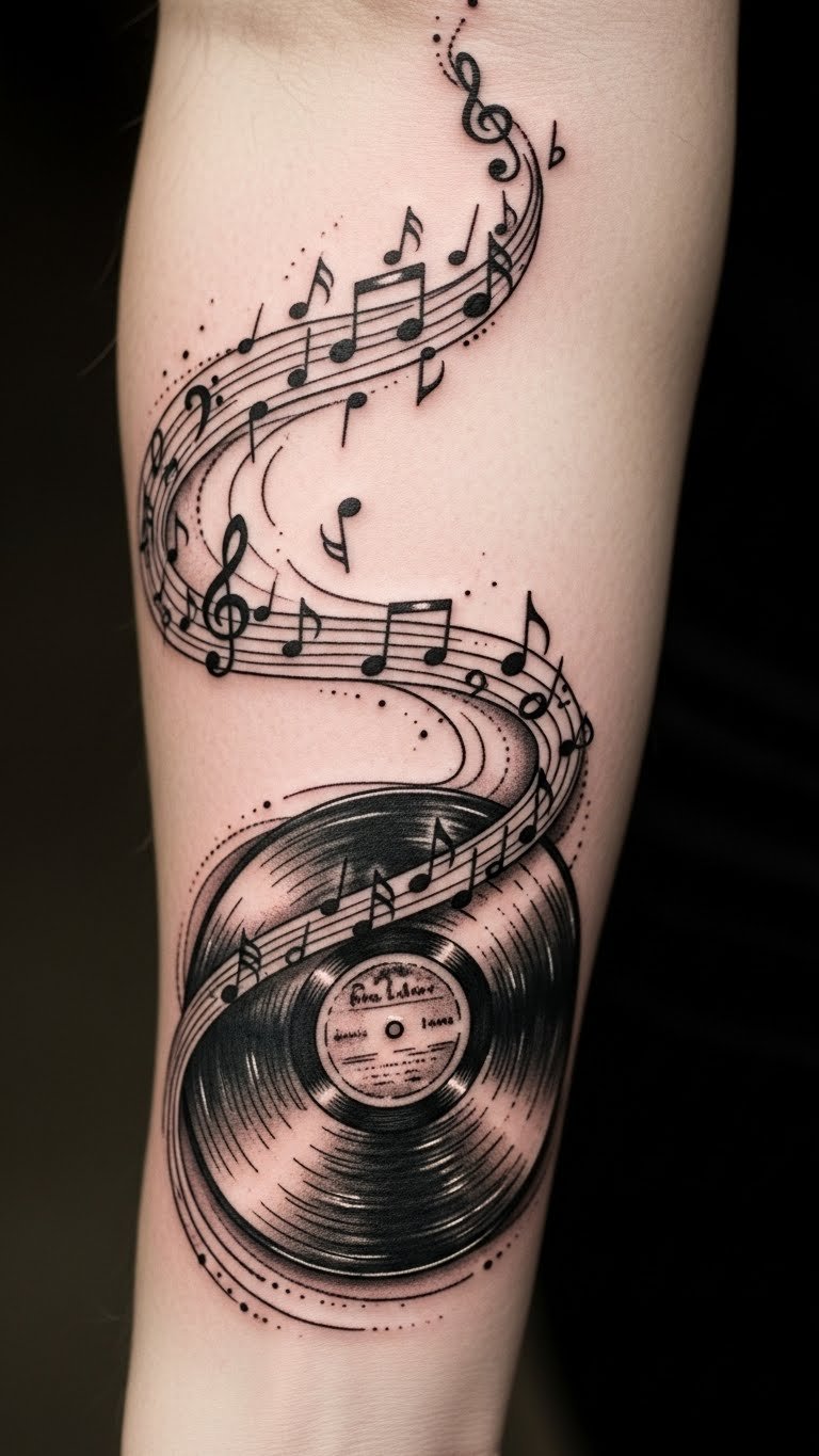 This tattoo embodies a deep appreciation for nostalgia and musical history, with the vintage record symbolizing timeless melodies and cherished memories.