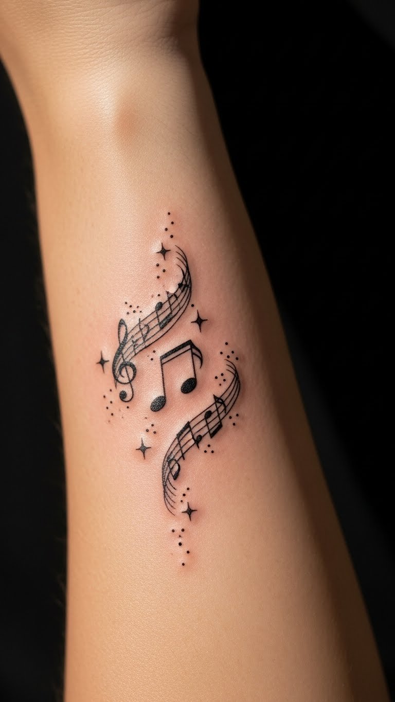 The placement on the inner forearm allows for easy visibility, serving as a daily reminder of cherished moments and the freedom that music offers. The swirling musical staffs and stars add a whimsical touch, representing the memories that dance through our minds, while the music note stands as a powerful emblem of individual stories and emotional resilience.