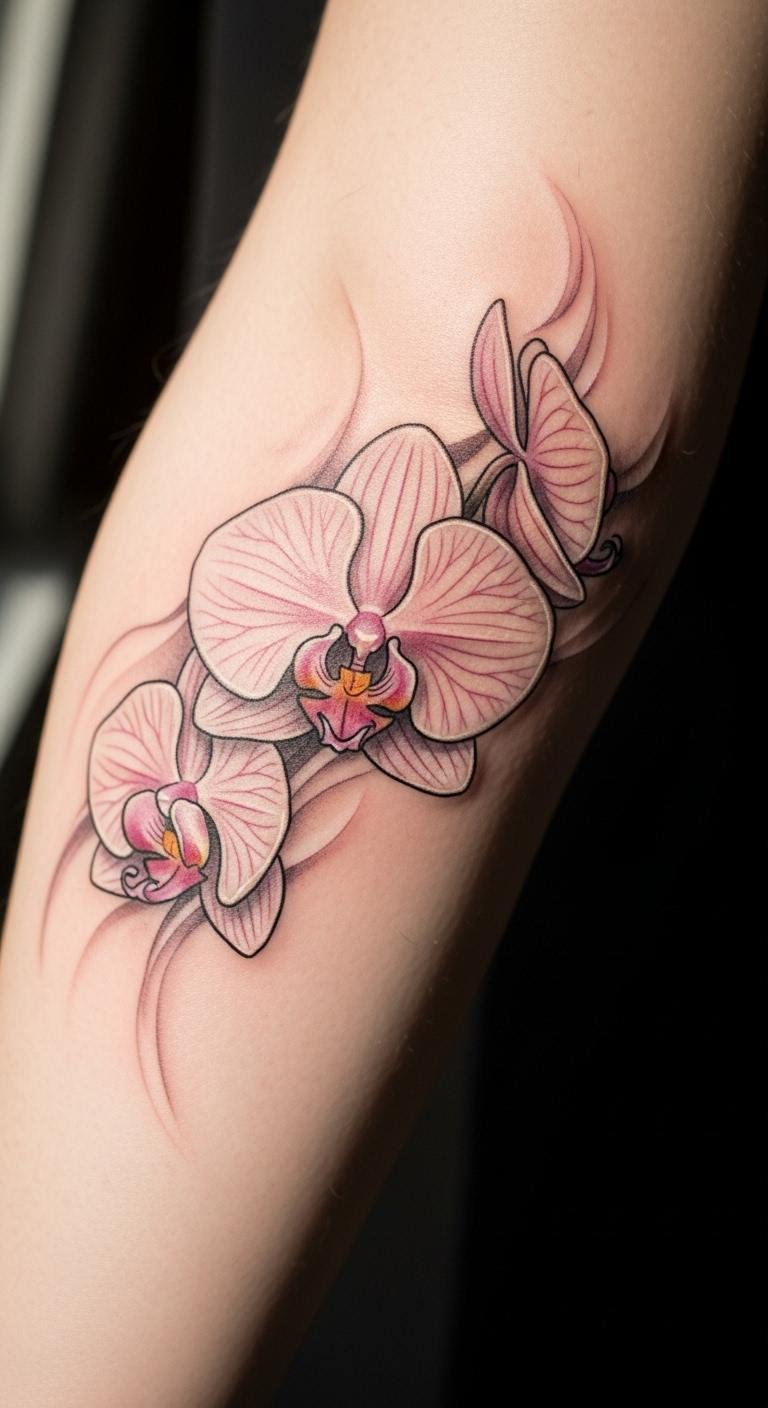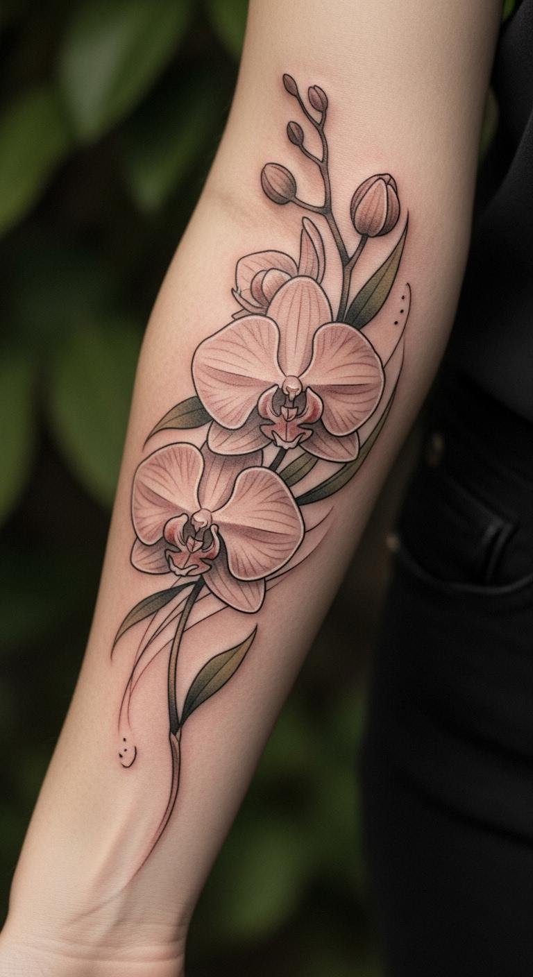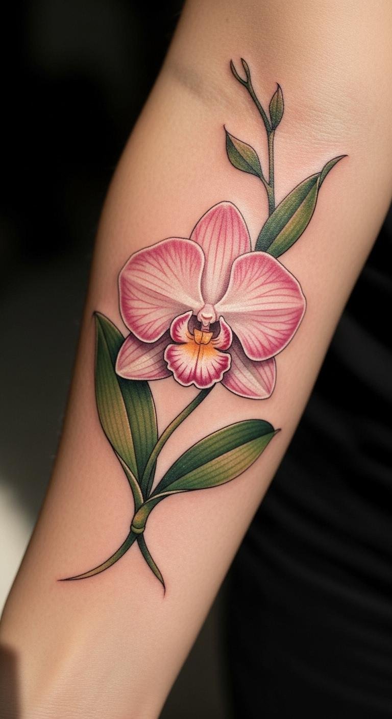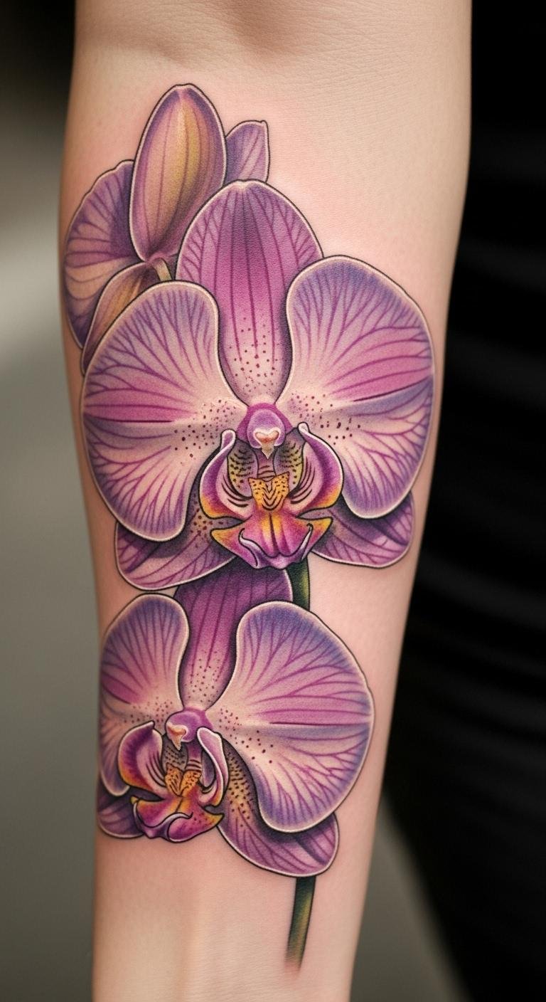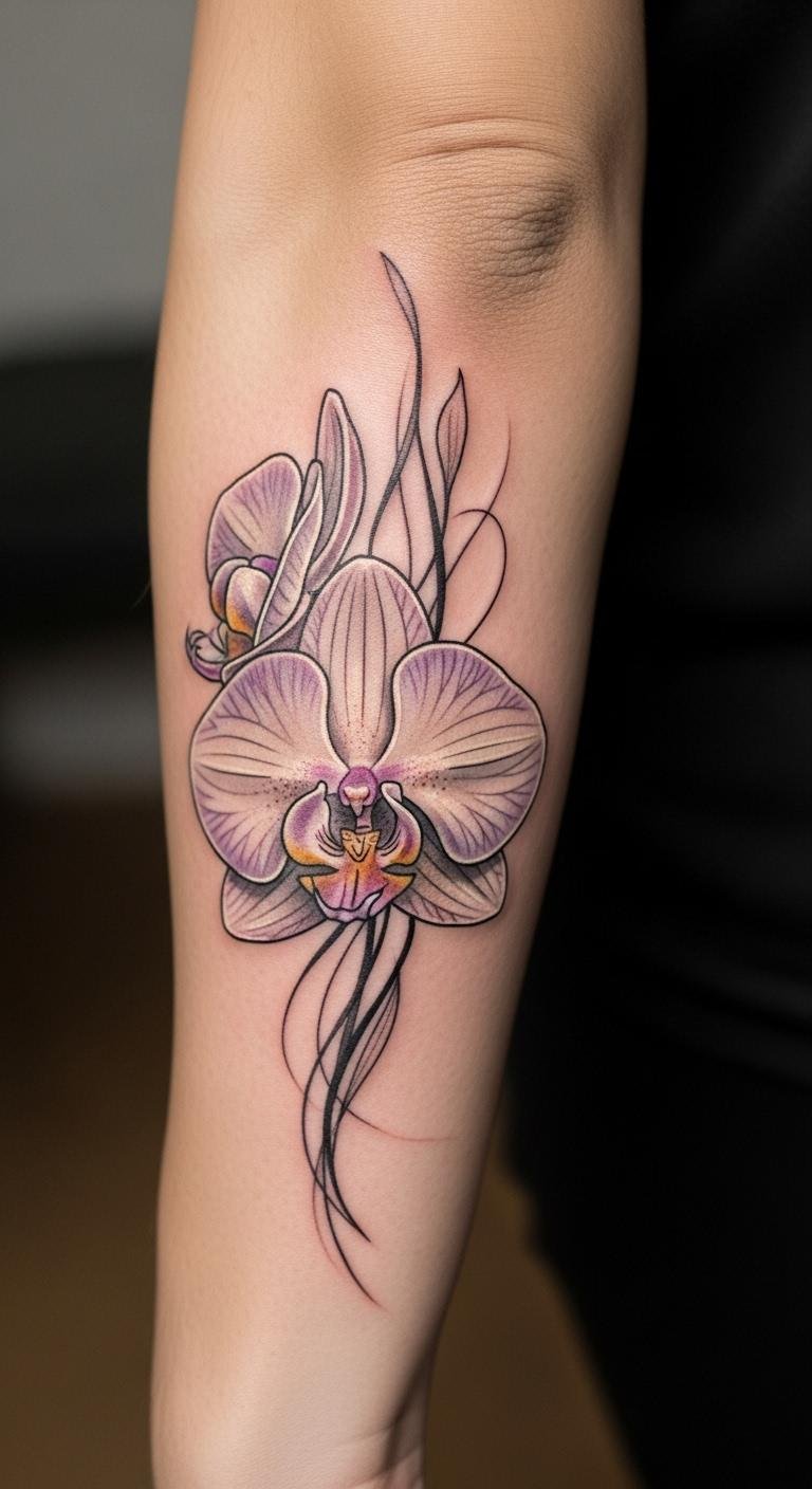 The orchid tattoo symbolizes inner harmony, emotional healing, and personal empowerment, making it an ideal choice for placement on the forearm where it can be easily seen.