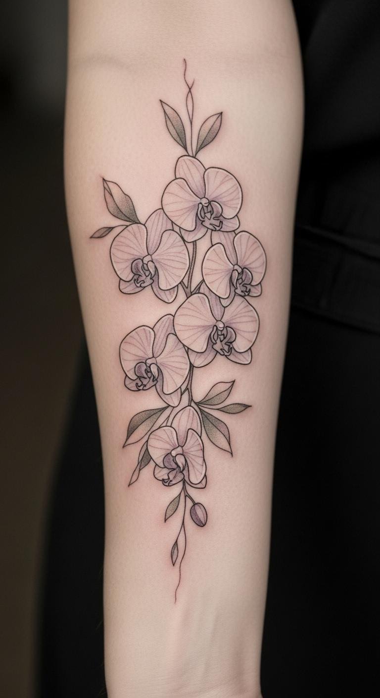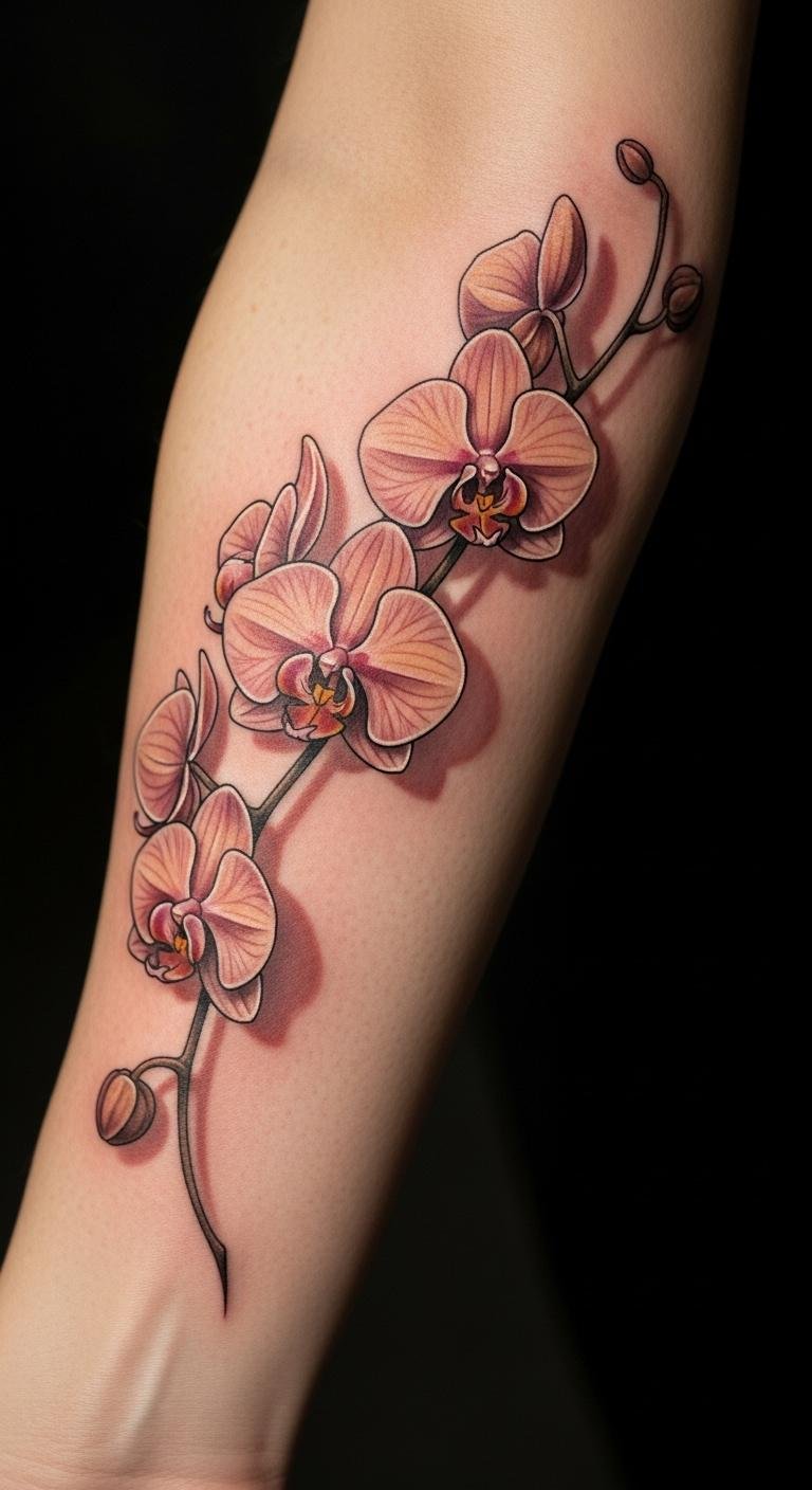 The orchid tattoo, placed on the forearm, symbolizes strength and resilience while exuding luxury and refinement. This placement allows for easy visibility, inviting admiration and appreciation.