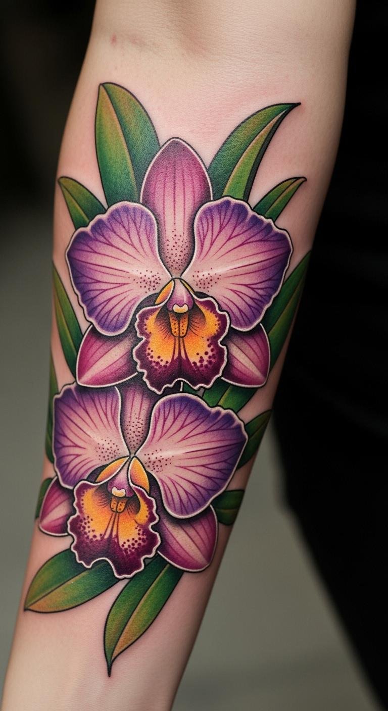 This orchid tattoo on the forearm serves as a powerful emblem of creativity and passion.