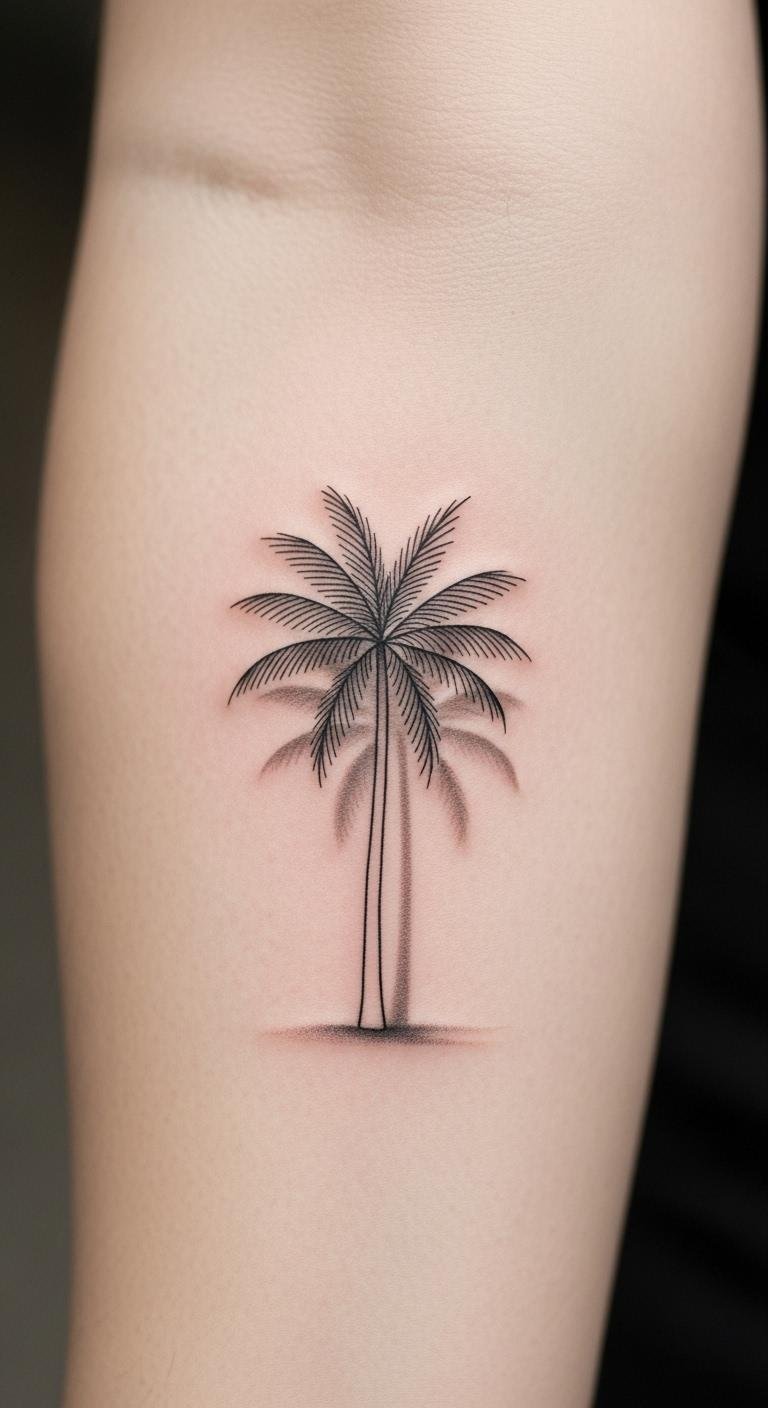 This minimalist palm tree tattoo symbolizes freedom and resilience, reflecting a journey filled with peace and adventure.