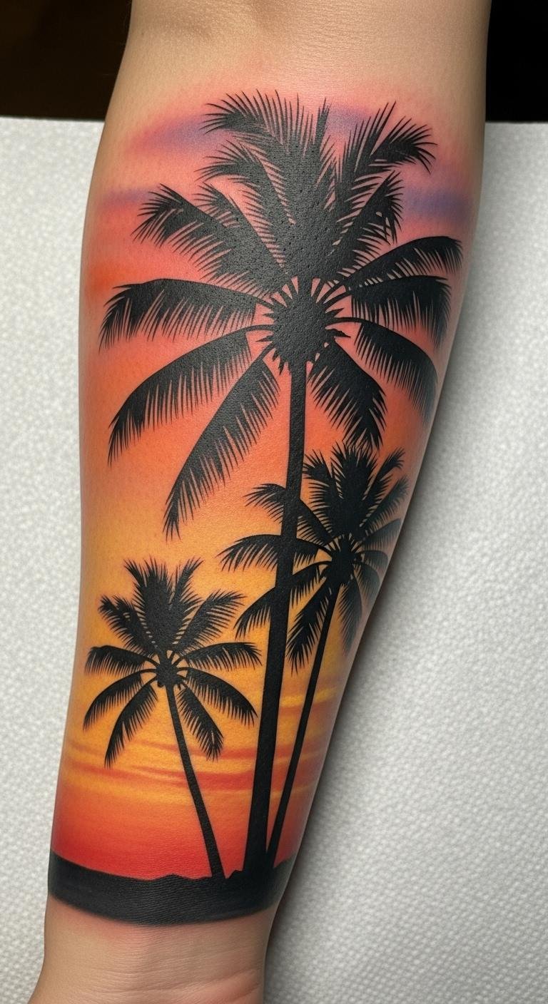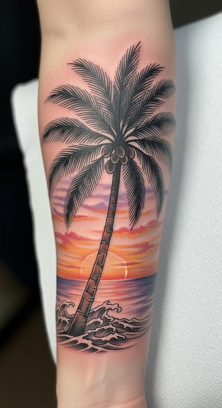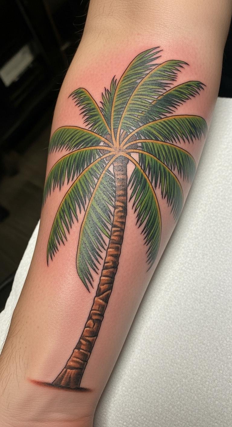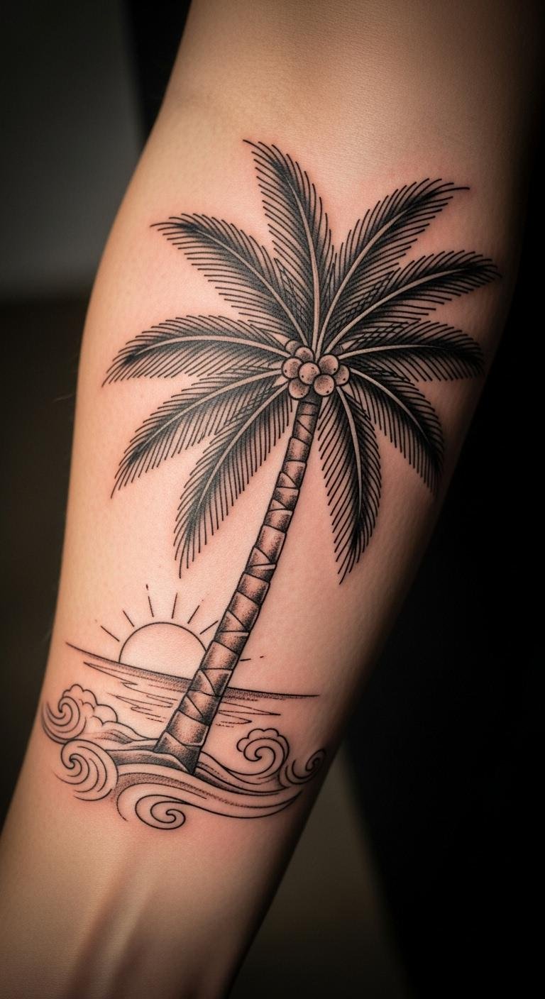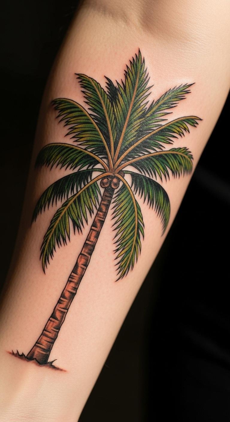 The palm tree tattoo on the forearm symbolizes freedom and resilience, inviting the wearer to embrace their journey of victory and endurance.