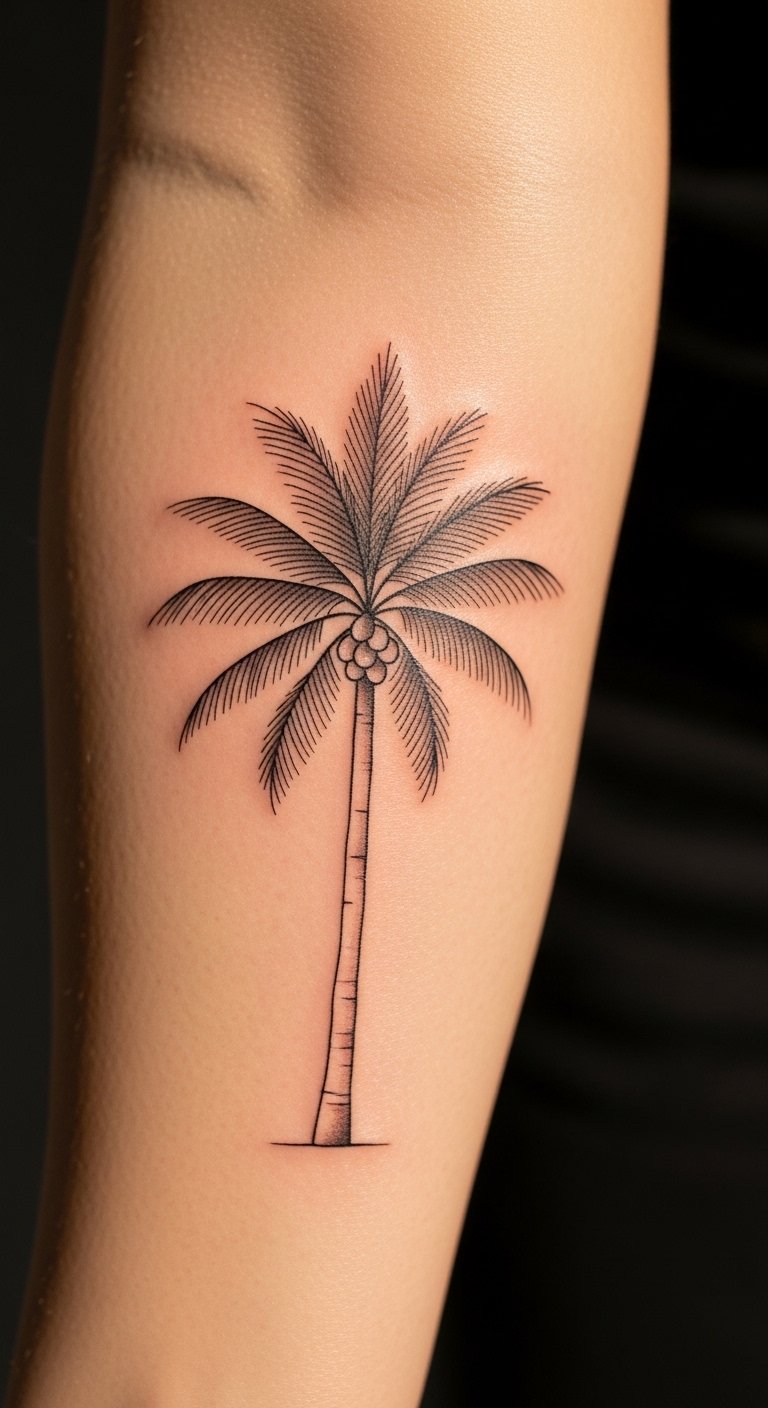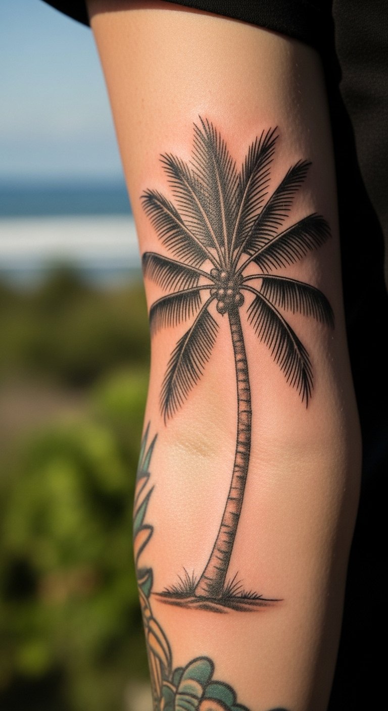 The palm tree symbolizes resilience, freedom, and a carefree spirit, making it a perfect choice for those who appreciate adventure and the beauty of nature. Placed on the forearm, this tattoo serves as a constant reminder of the warmth of summer and the joy of exploration, allowing the wearer to carry a piece of paradise wherever they go.