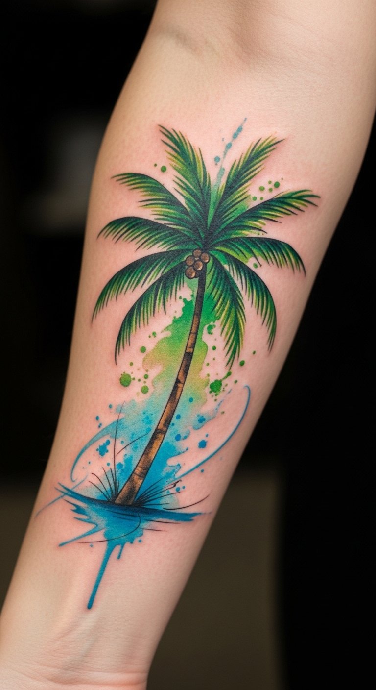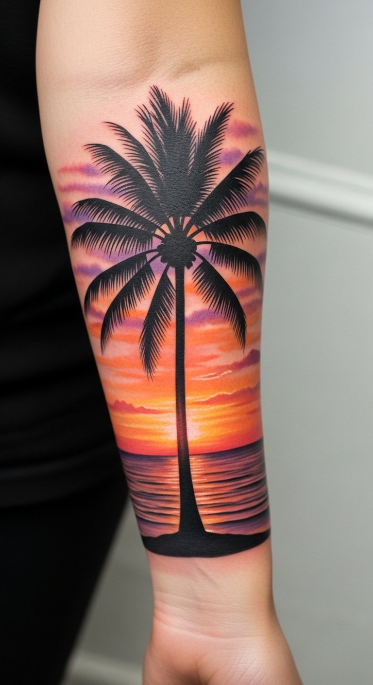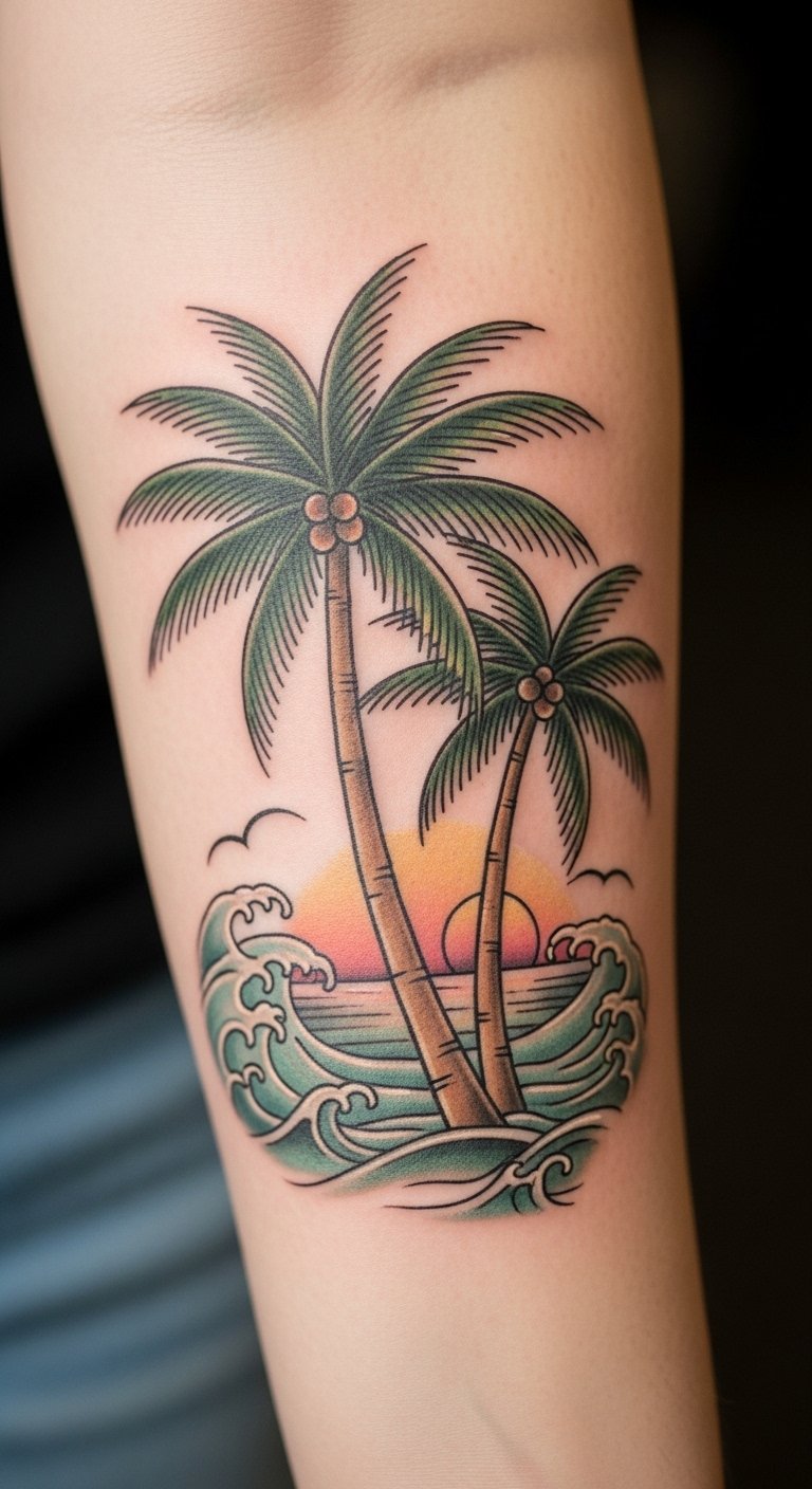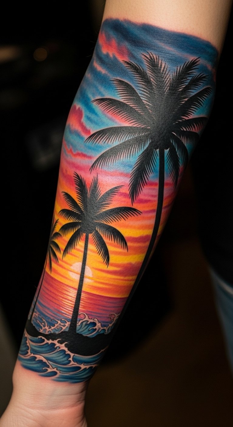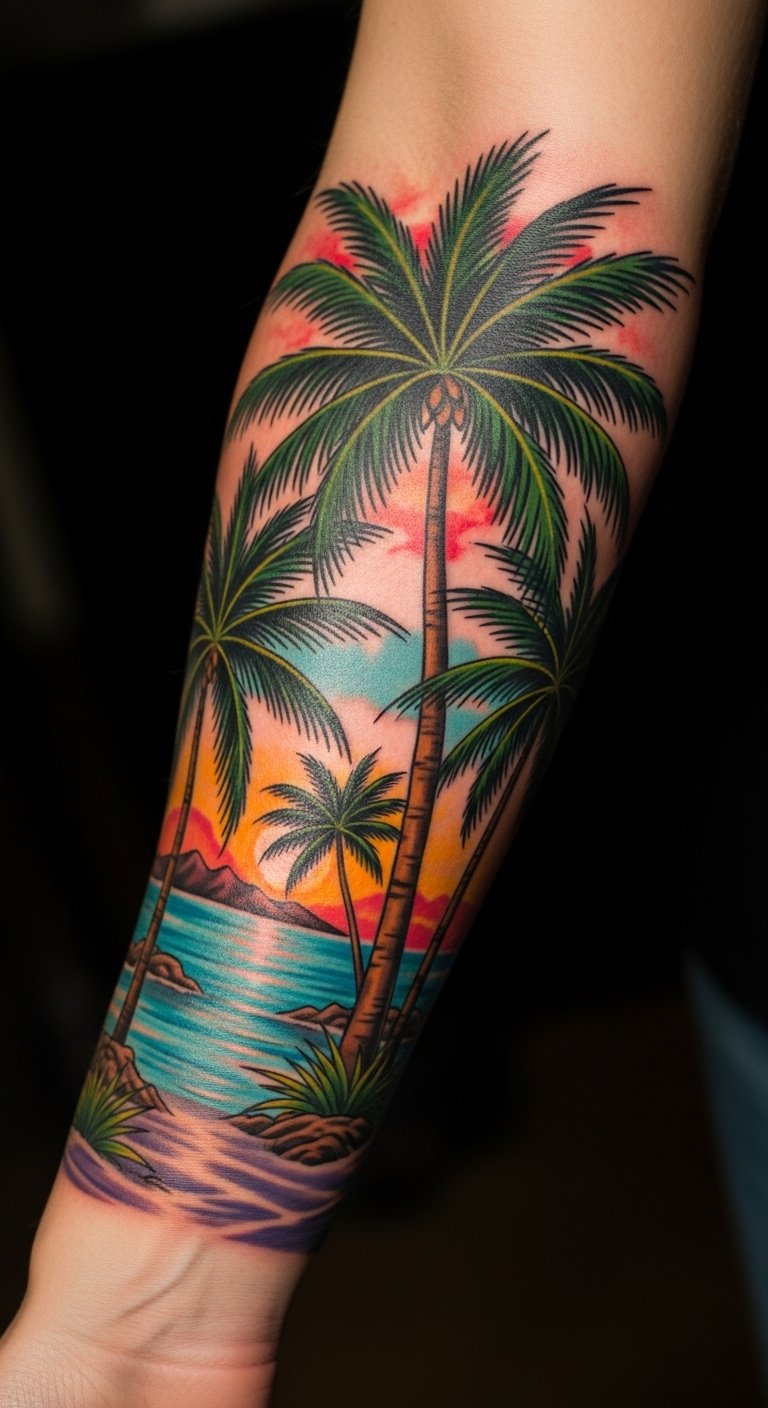 Positioned prominently on the forearm, it becomes a canvas for personal expression, inviting onlookers to share in the joy of adventure. Each palm tree reflects a journey and a love for nature, while the vibrant colors evoke warmth and positivity.