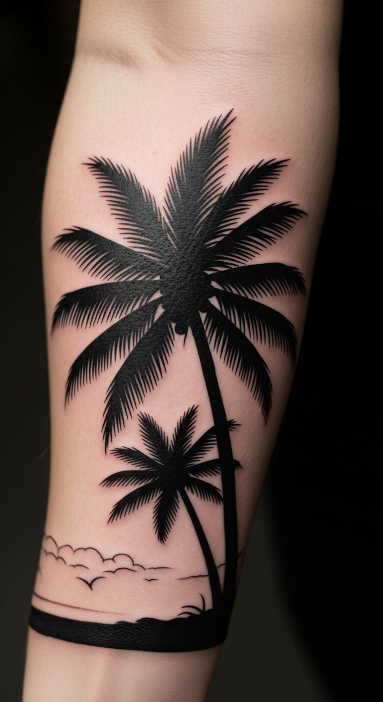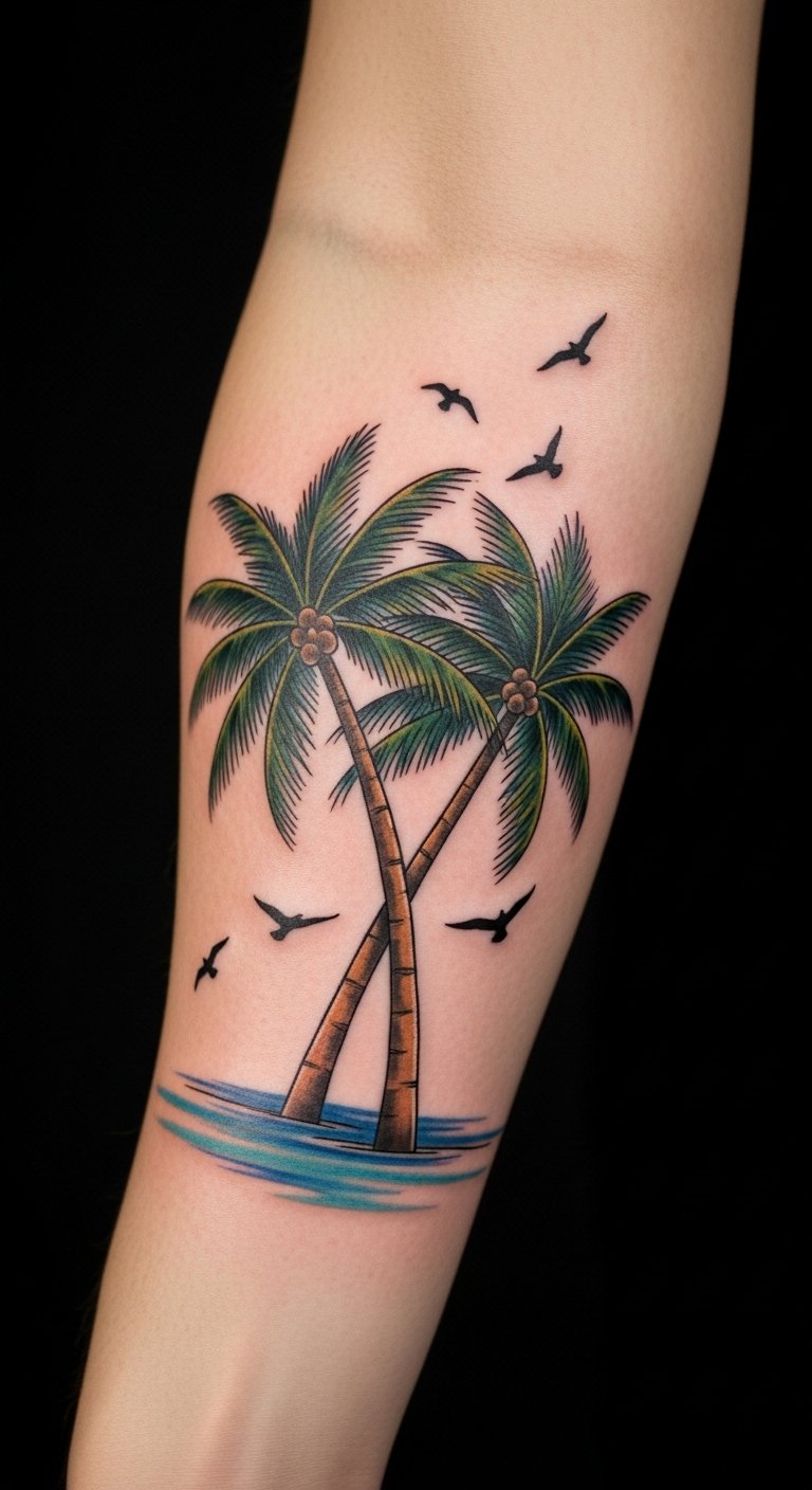 The double palm tree tattoo represents connection and duality, embodying themes of freedom and adventure.