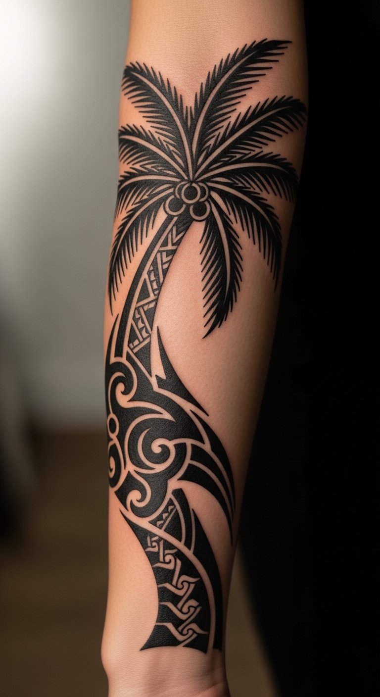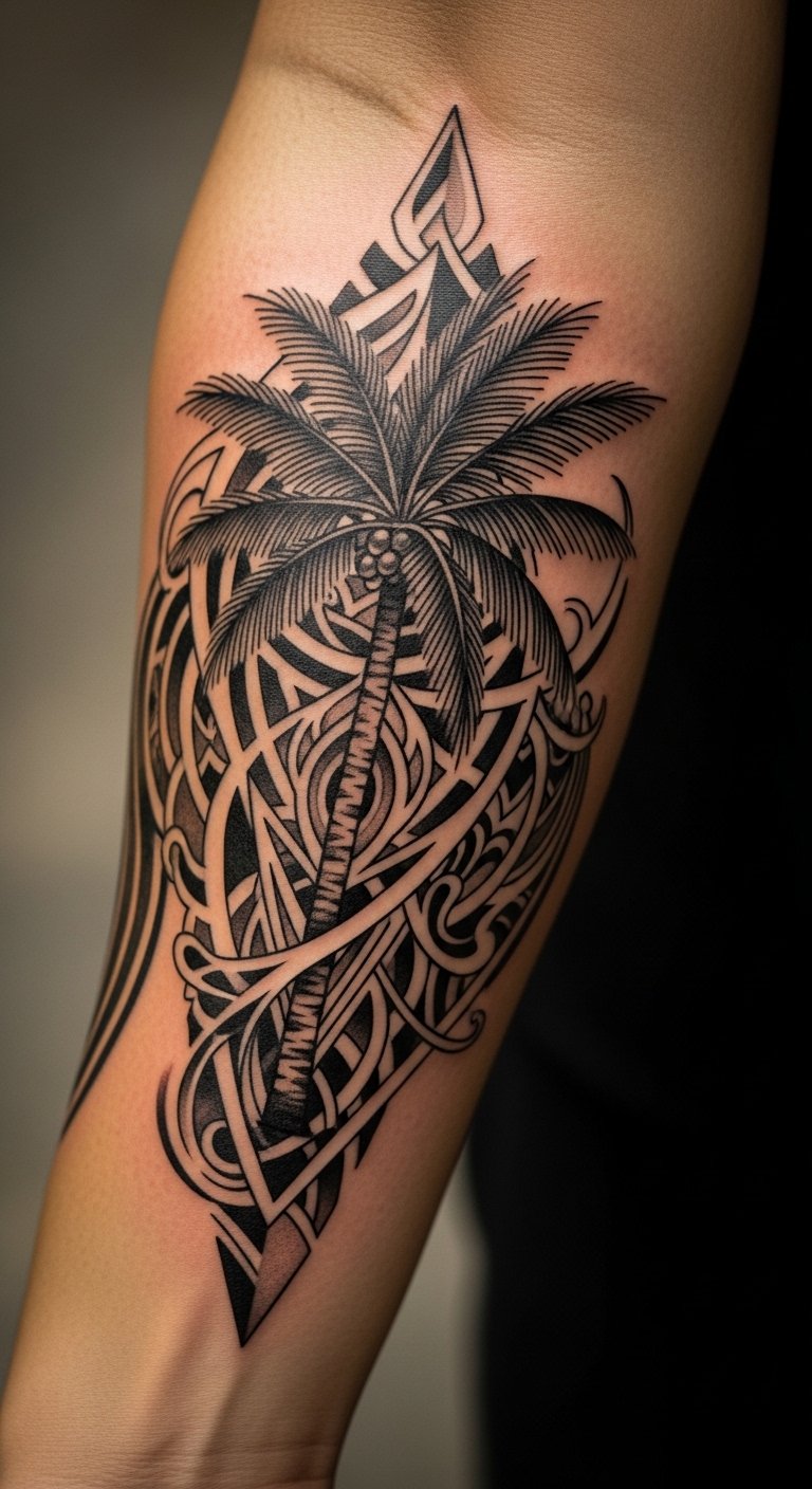 This tribal palm tree tattoo symbolizes freedom and resilience, embodying the spirit of adventure and connection to nature.