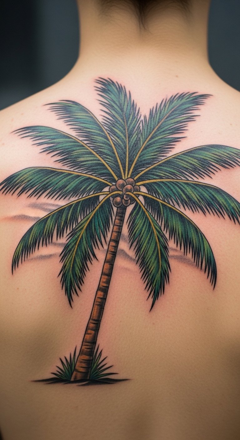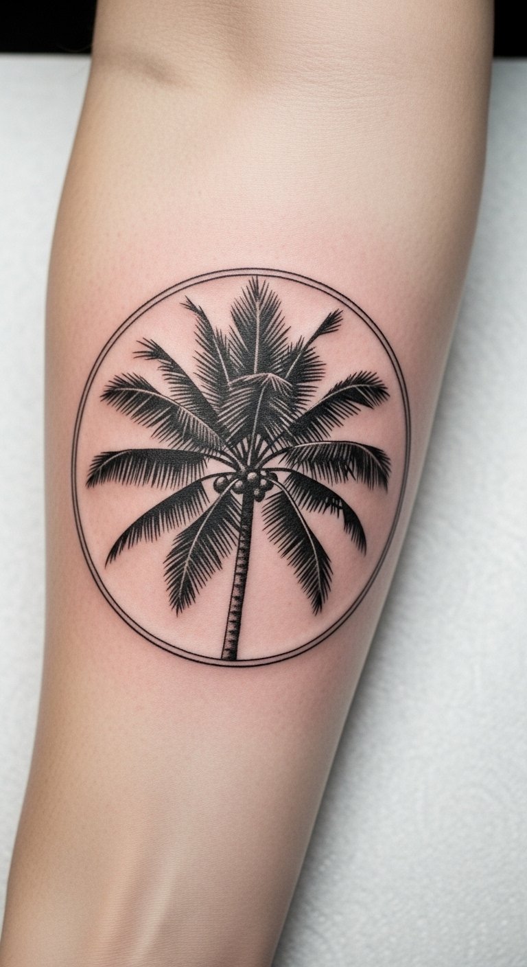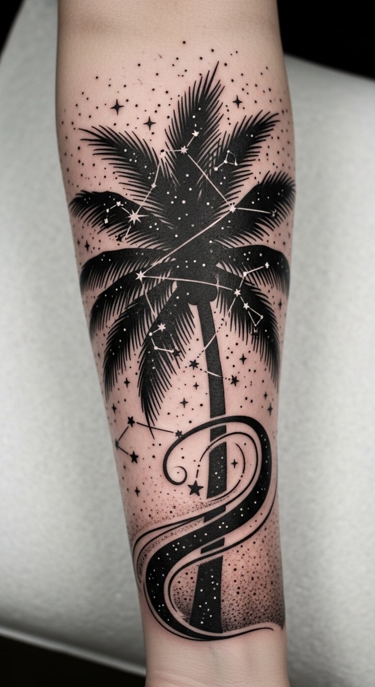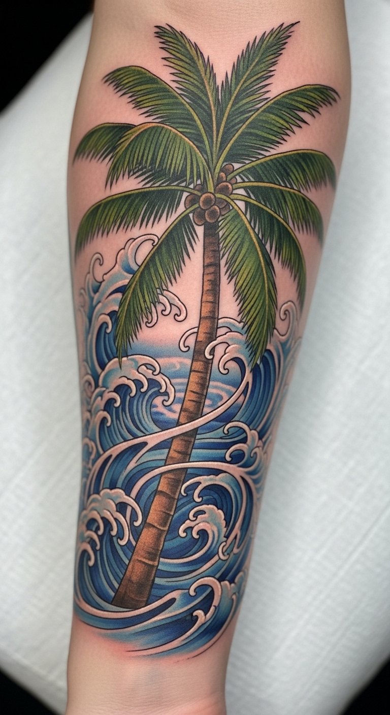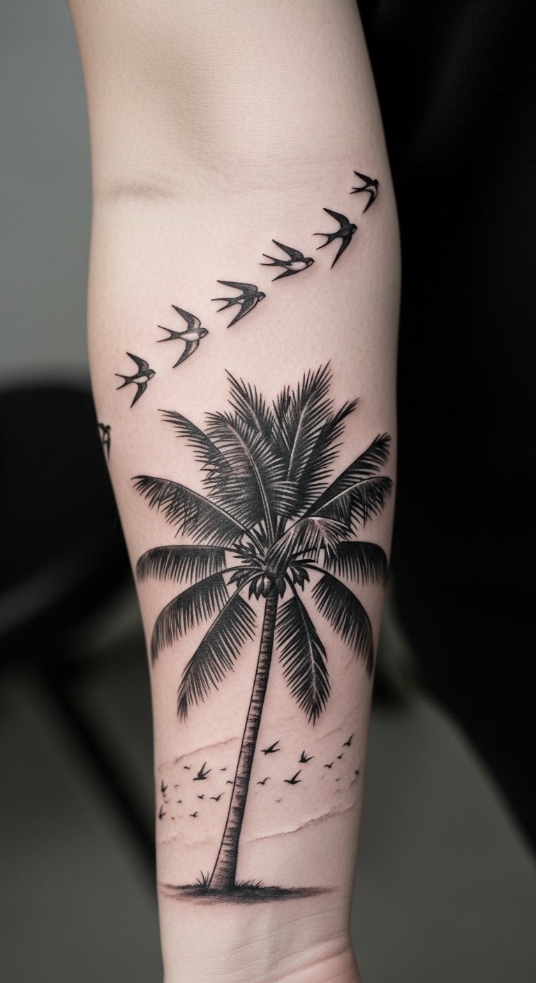 This tattoo symbolizes freedom and adventure, with the palm tree representing resilience and a carefree spirit.