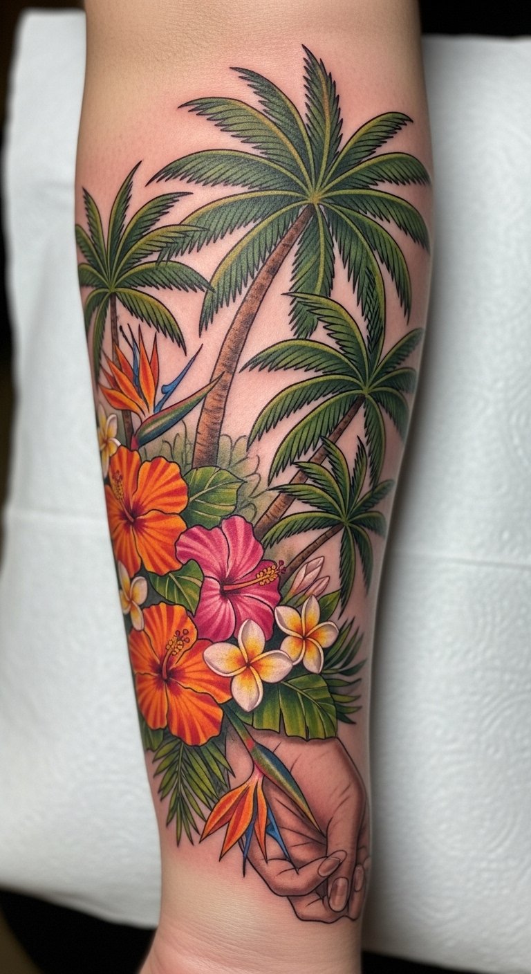 The palm tree symbolizes freedom and resilience, while tropical flowers represent beauty and vitality, creating a harmonious blend that evokes feelings of paradise.