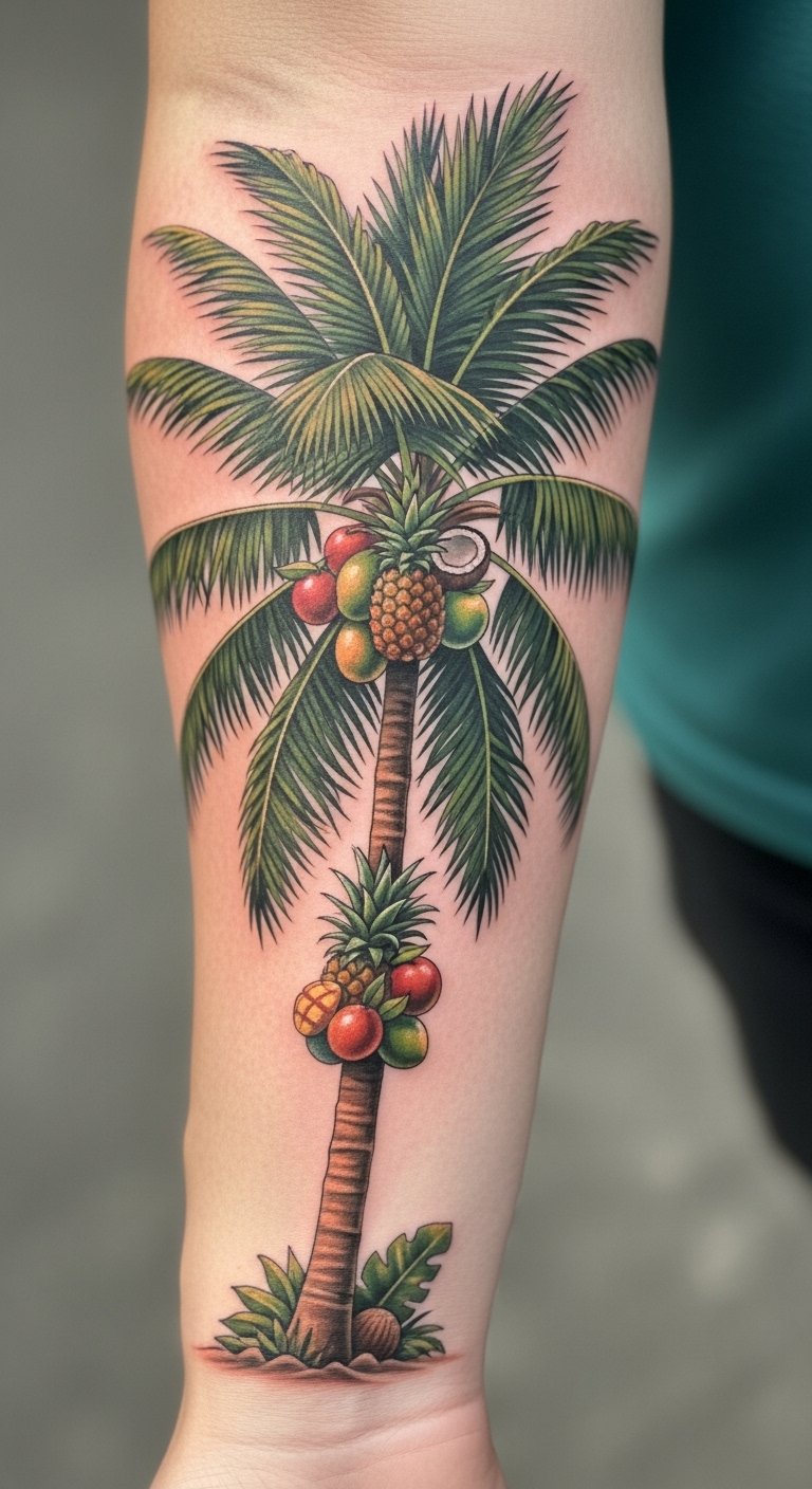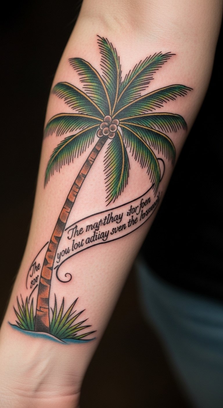 This tattoo, placed on the forearm, allows for easy visibility and personal display, serving as a reminder of cherished memories or aspirations connected to tropical landscapes.