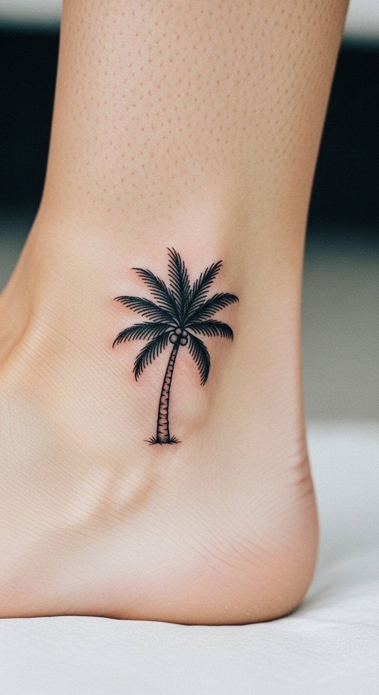 This small ankle palm tree tattoo symbolizes a spirit of wanderlust and a connection to nature’s beauty.