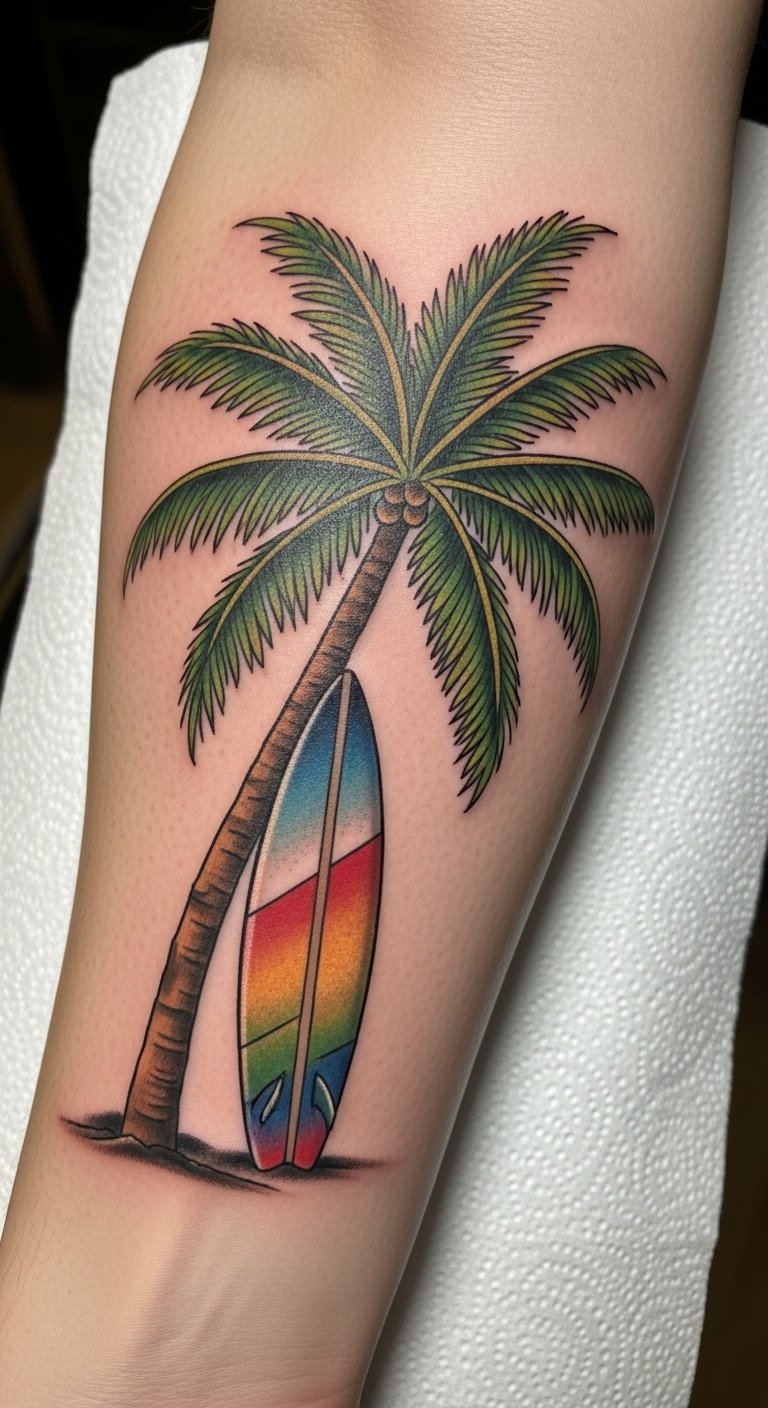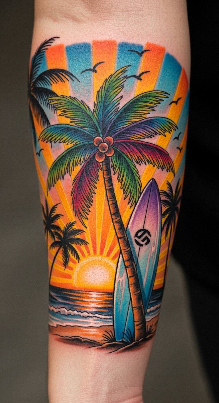 Placed on the forearm, it serves as a constant reminder of one’s love for beach culture and the vibrant experiences of life’s journey, making it a personal expression of one’s adventurous spirit and cultural roots.
