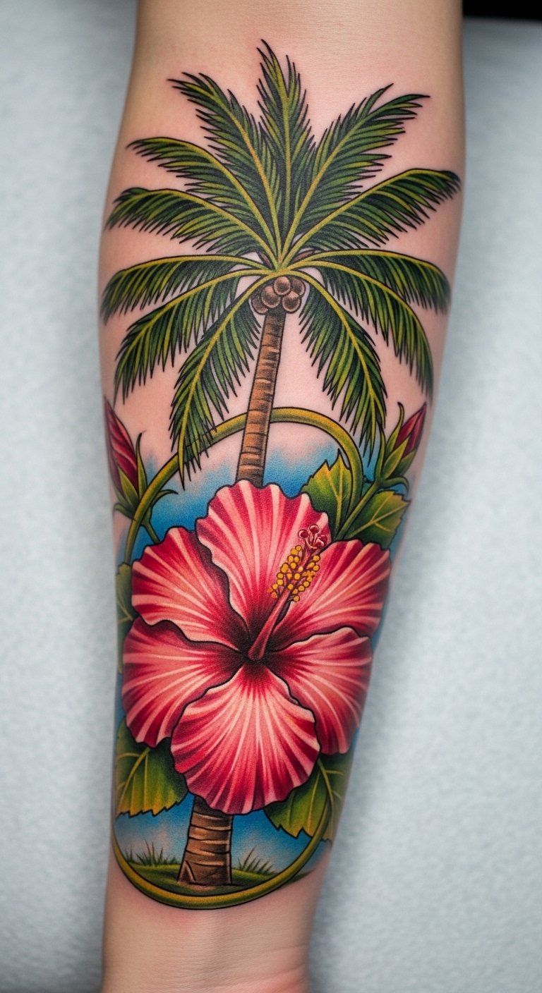 This tattoo symbolizes freedom and peace, mirroring the hibiscus flower’s beauty against the backdrop of the resilient palm tree.