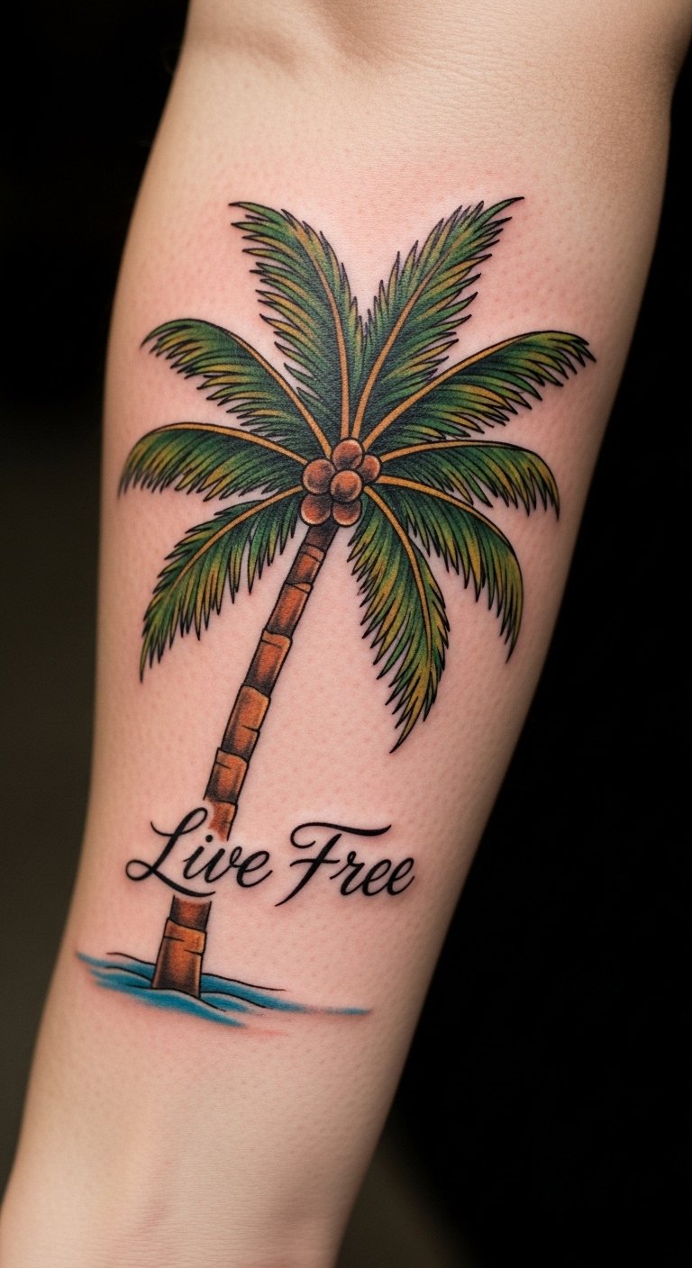Incorporating this palm tree tattoo with the quote “Live Free” symbolizes a spirit of adventure and the pursuit of personal freedom.