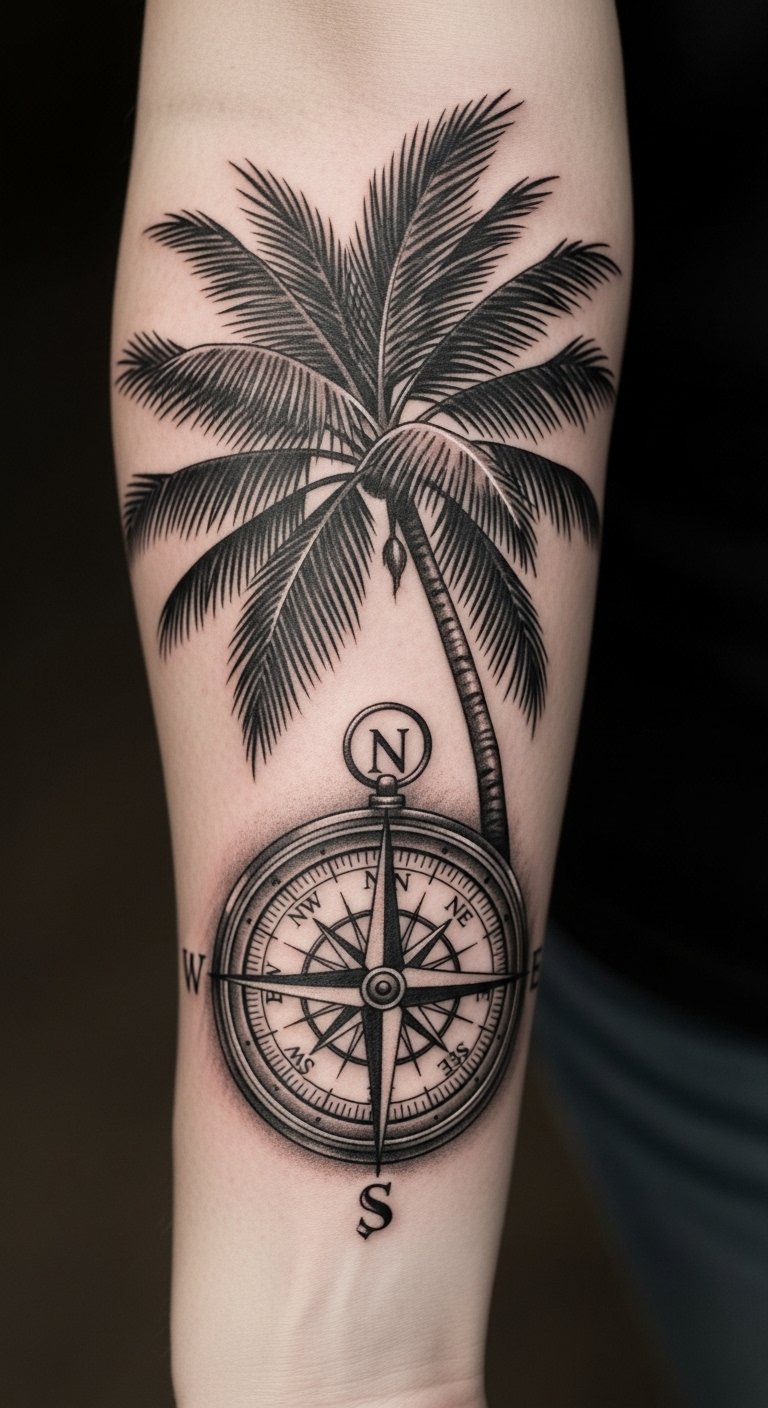 This tattoo design symbolizes the spirit of adventure and exploration, merging the palm tree’s representation of tropical freedom with the compass’s guidance through life’s journeys.
