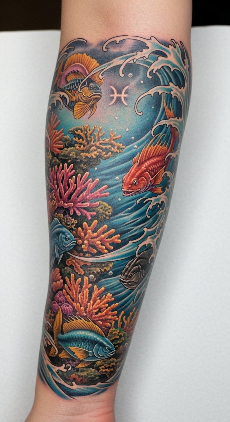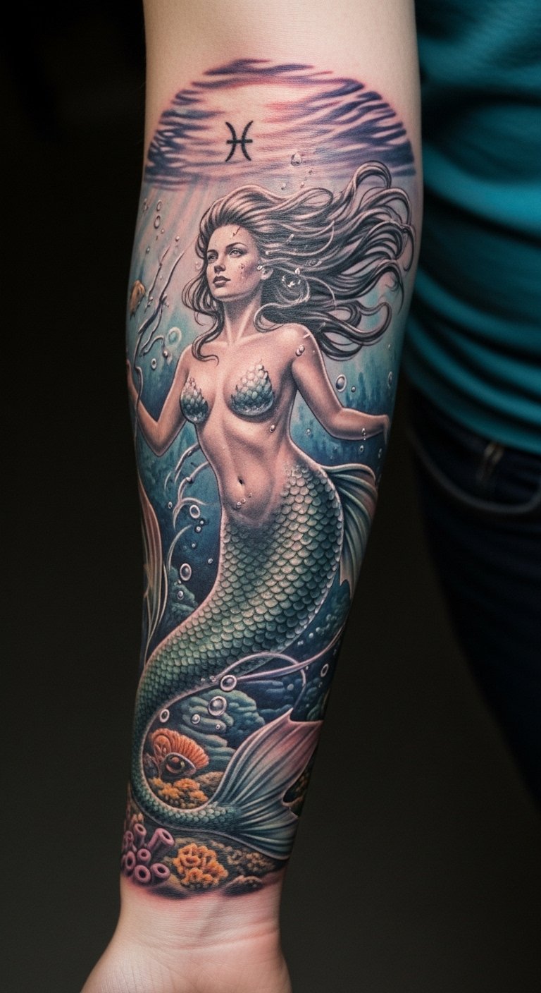 This tattoo symbolizes the deep emotional connection of Pisces to the sea, representing intuition, creativity, and the mystical qualities associated with the water sign.