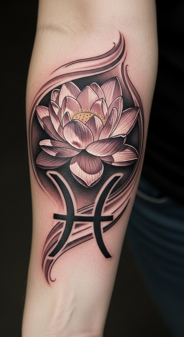 This tattoo design symbolizes the fluidity and creativity associated with Pisces, embodying the emotional depth and intuitive nature of those born under this sign.
