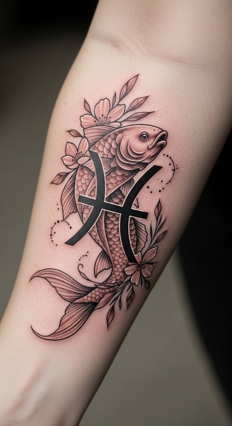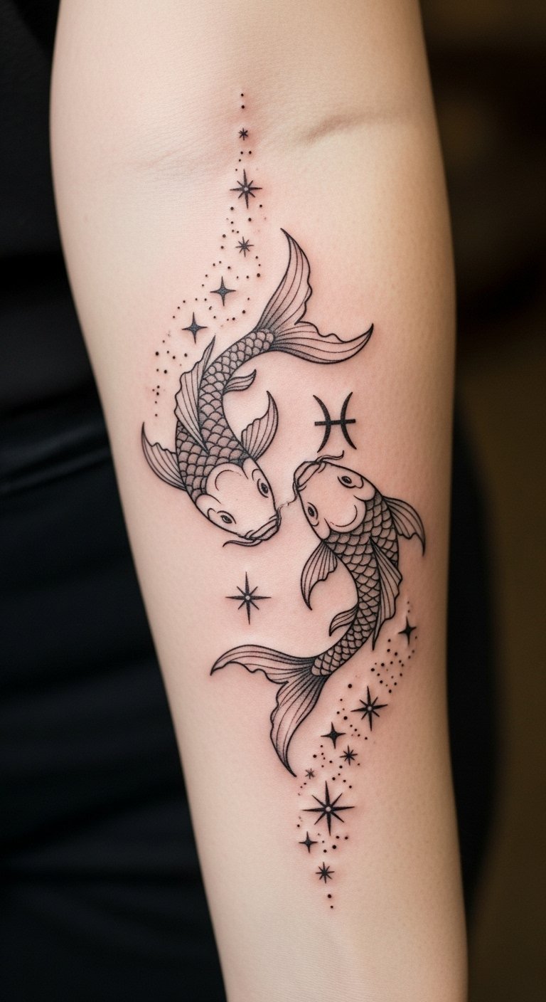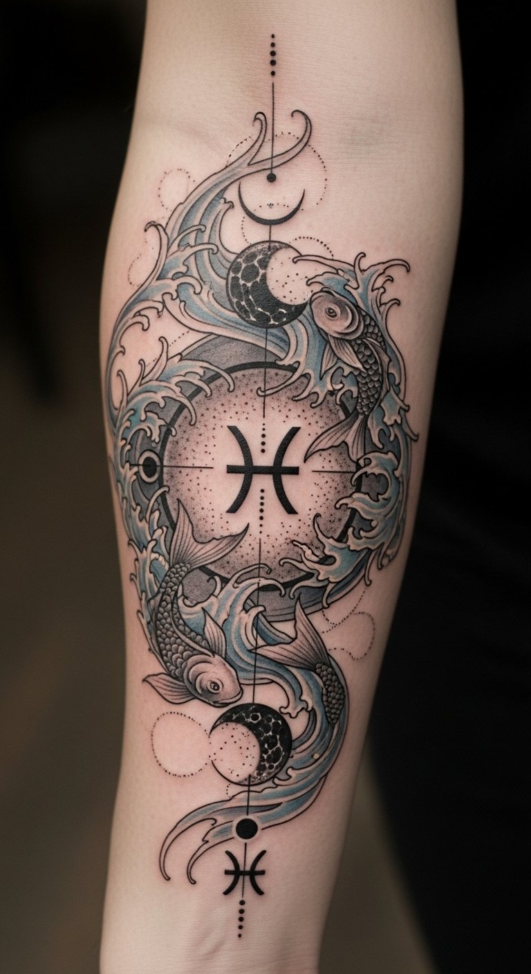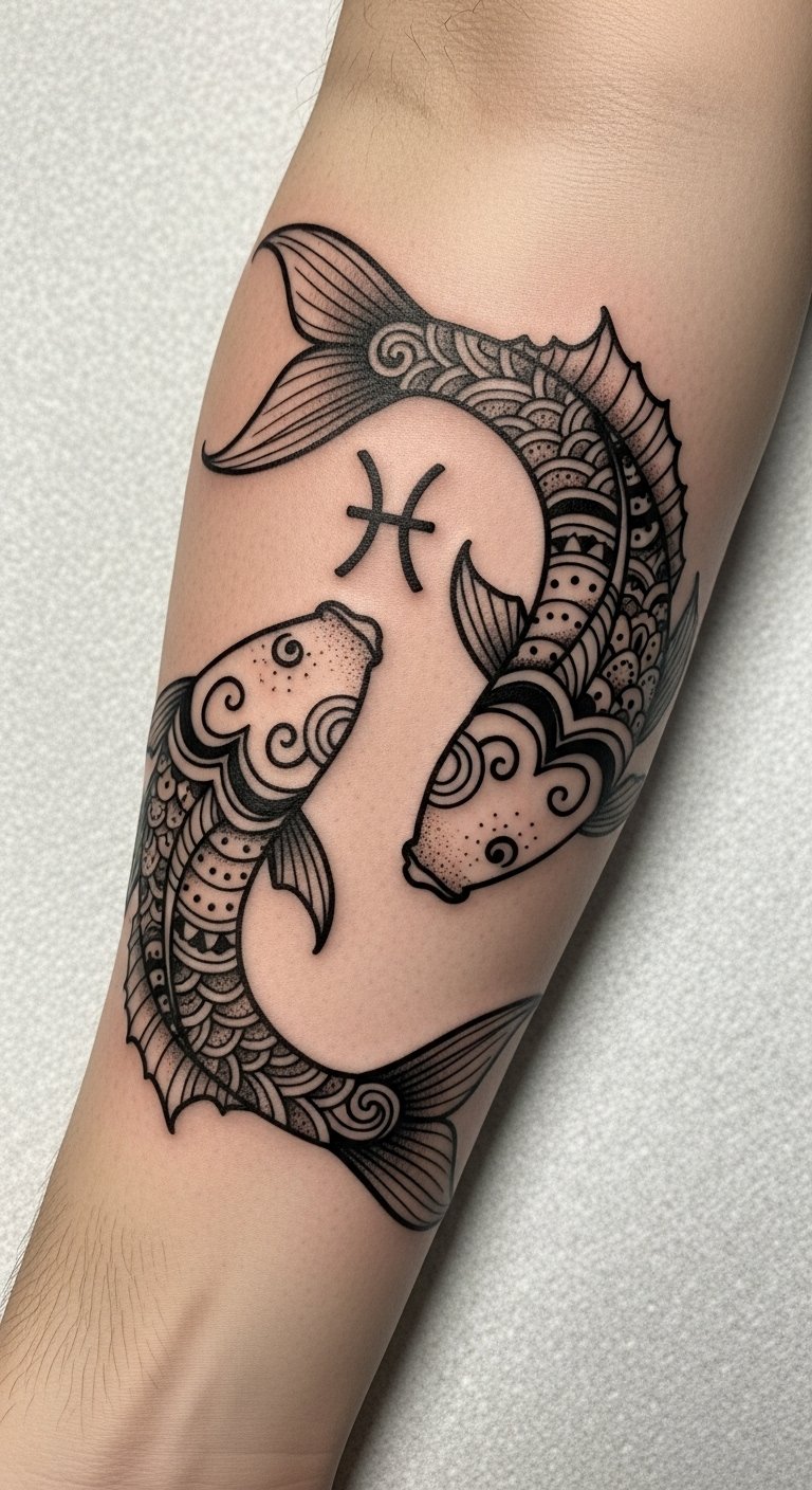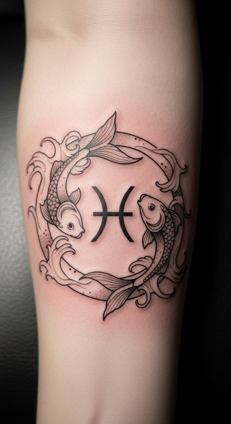 This tattoo, placed on the forearm, symbolizes the duality of Pisces, inviting introspection and creativity.