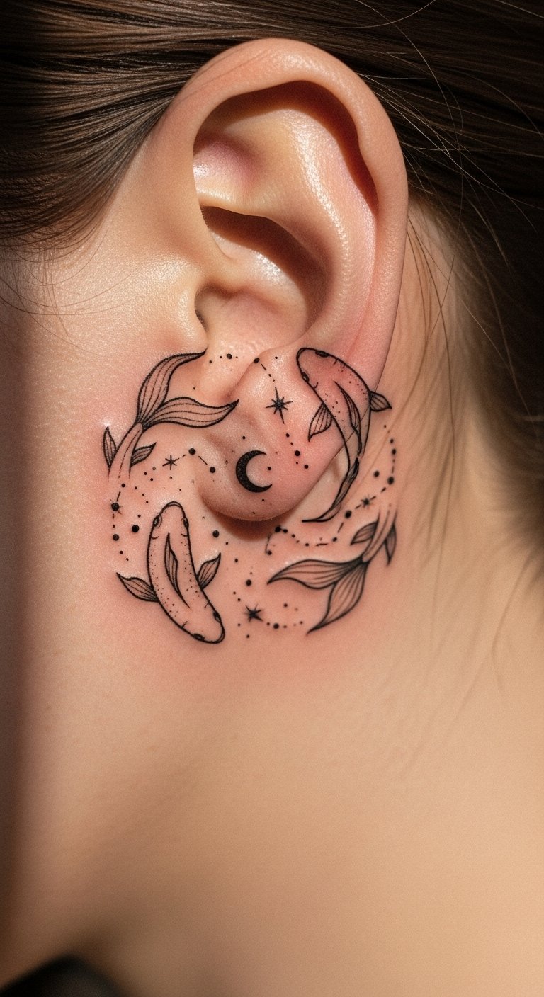 This small behind-the-ear tattoo beautifully symbolizes the essence of Pisces, reflecting intuition and creativity. The delicate fish represent the fluid nature of emotions, while the celestial motifs evoke dreams and aspirations.