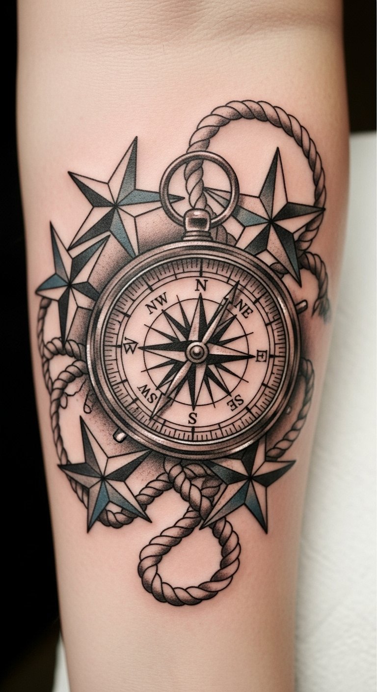The compass represents direction in life, while the nautical stars illuminate the path ahead, celebrating the mystical depths of the sea and the artistic heart of Pisces.