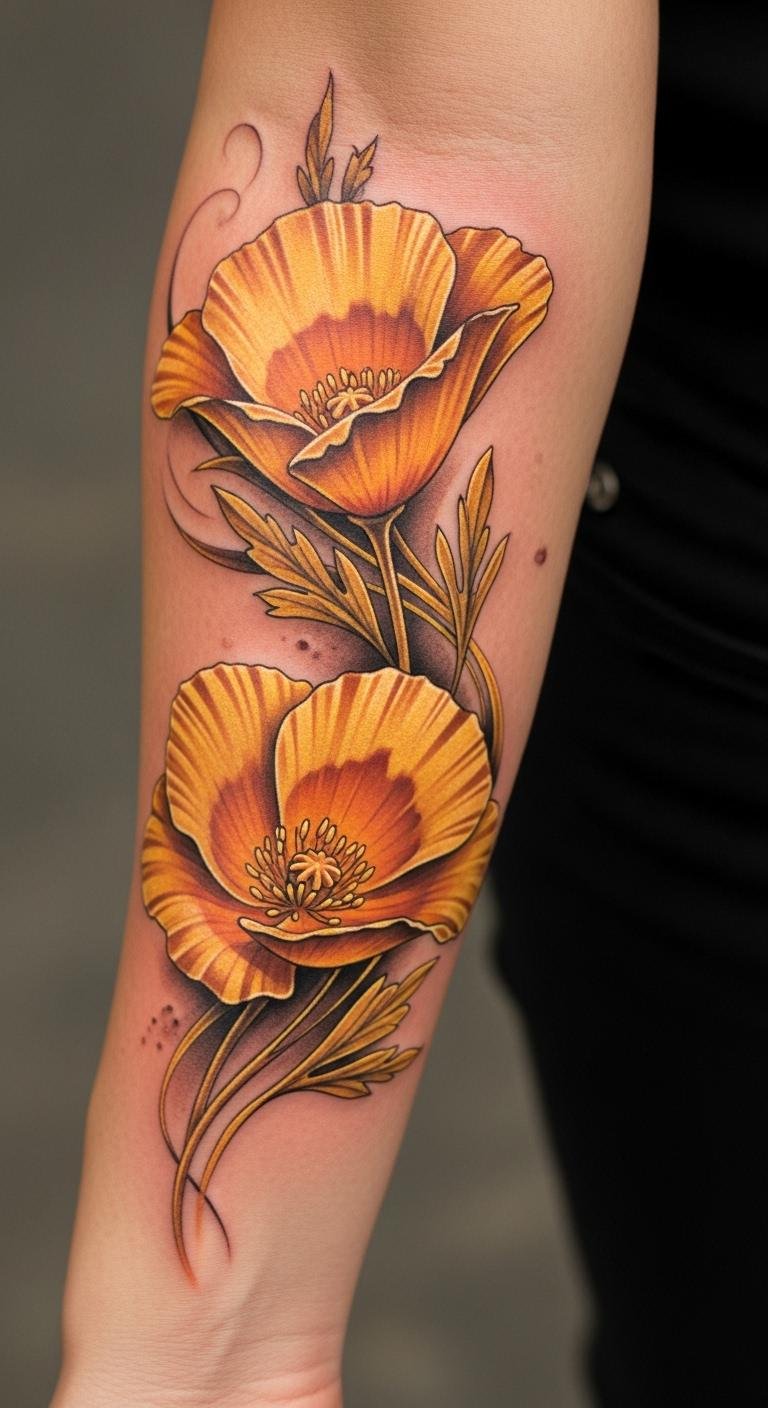 The golden poppy tattoo serves as a powerful emblem of California’s resilience and pride, symbolizing the warmth and beauty of the Golden State.