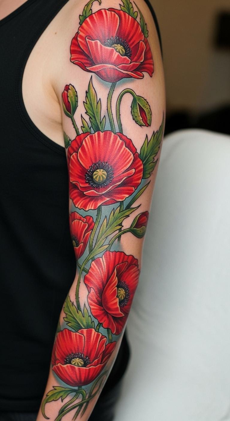 The poppy sleeve tattoo symbolizes the beauty of life’s fleeting moments and the strength found in resilience.