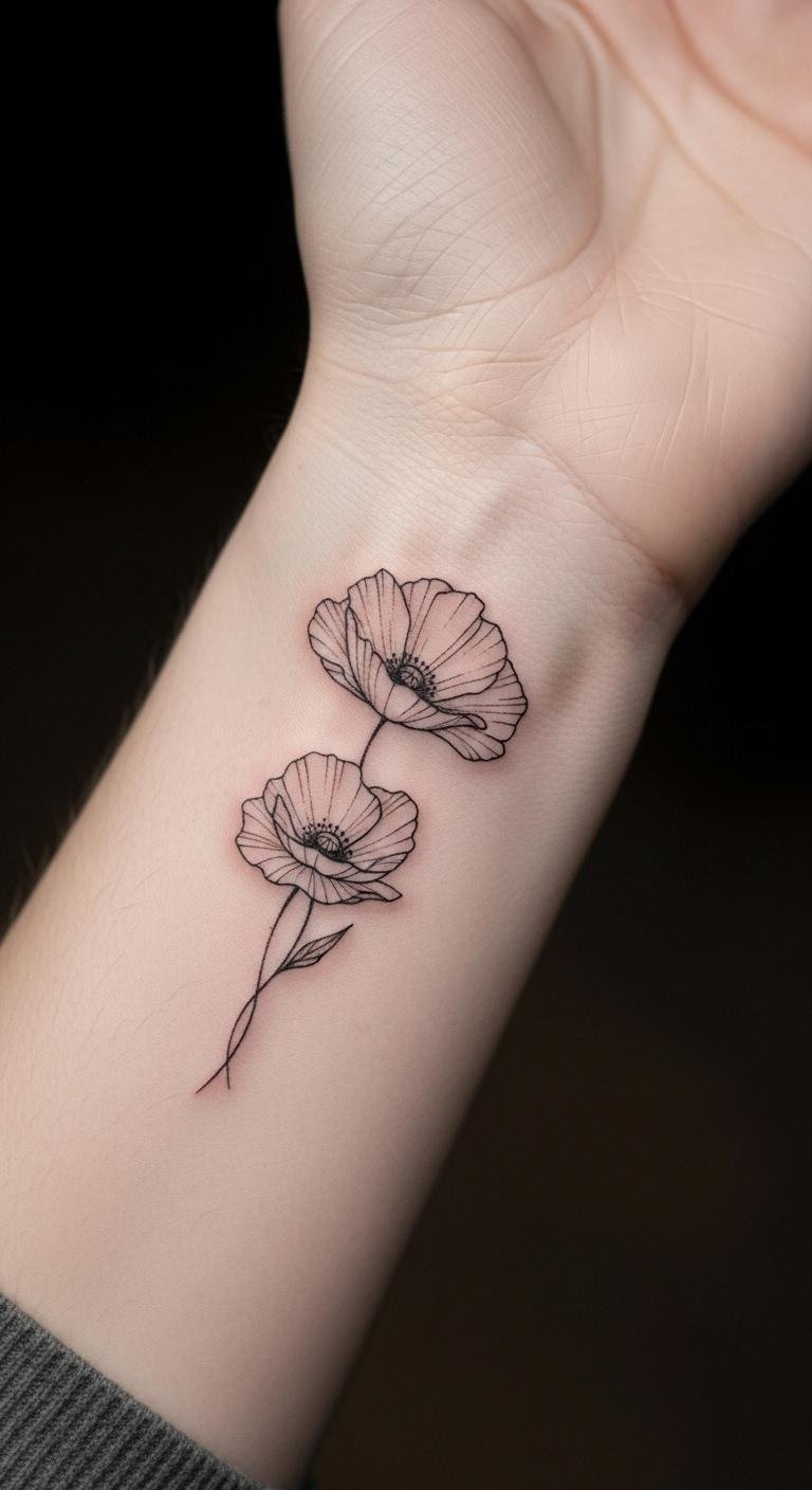 The minimalist poppy tattoo captures a sense of calm and beauty, symbolizing remembrance and peace.