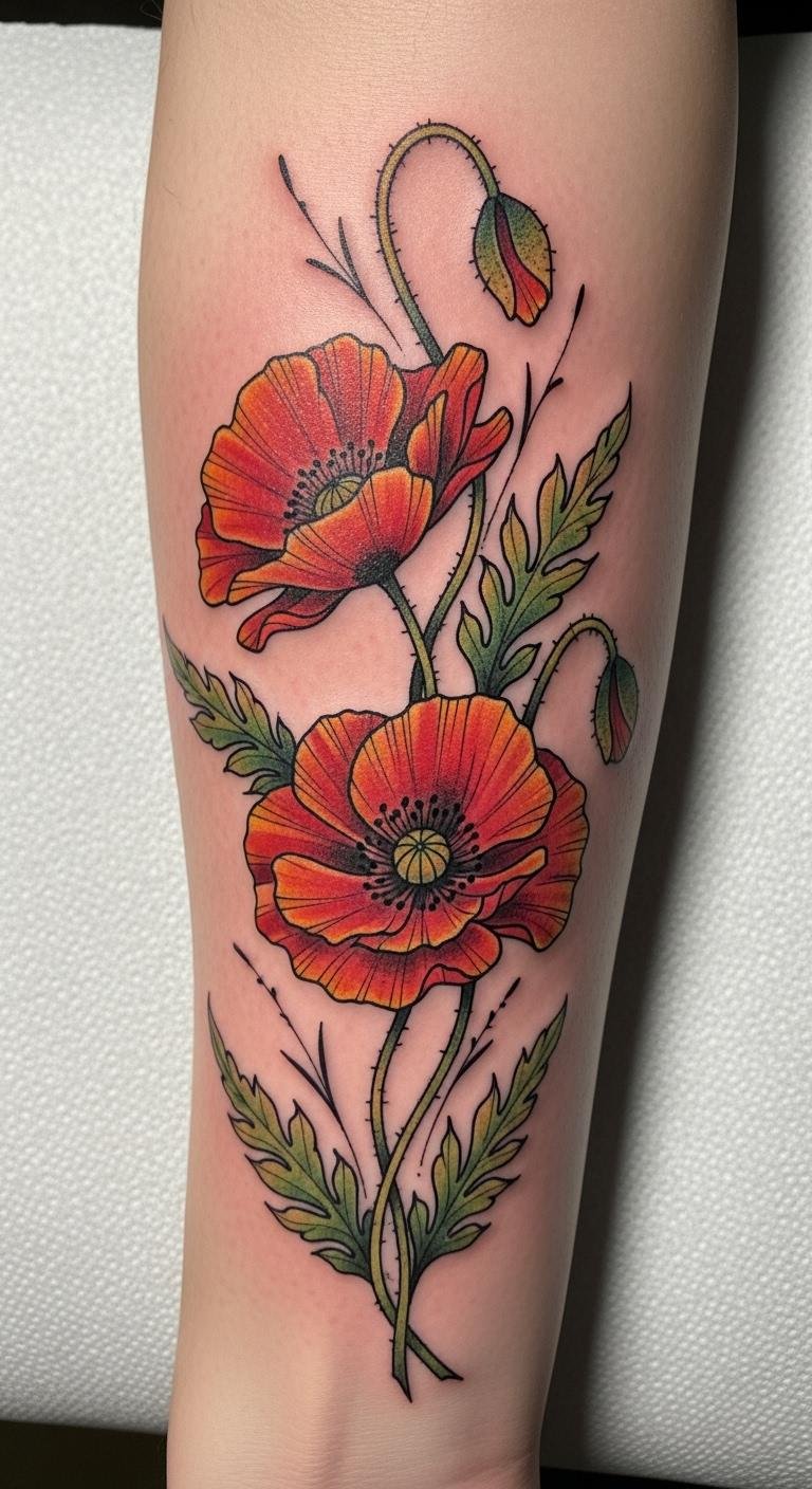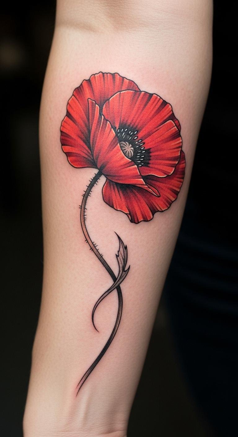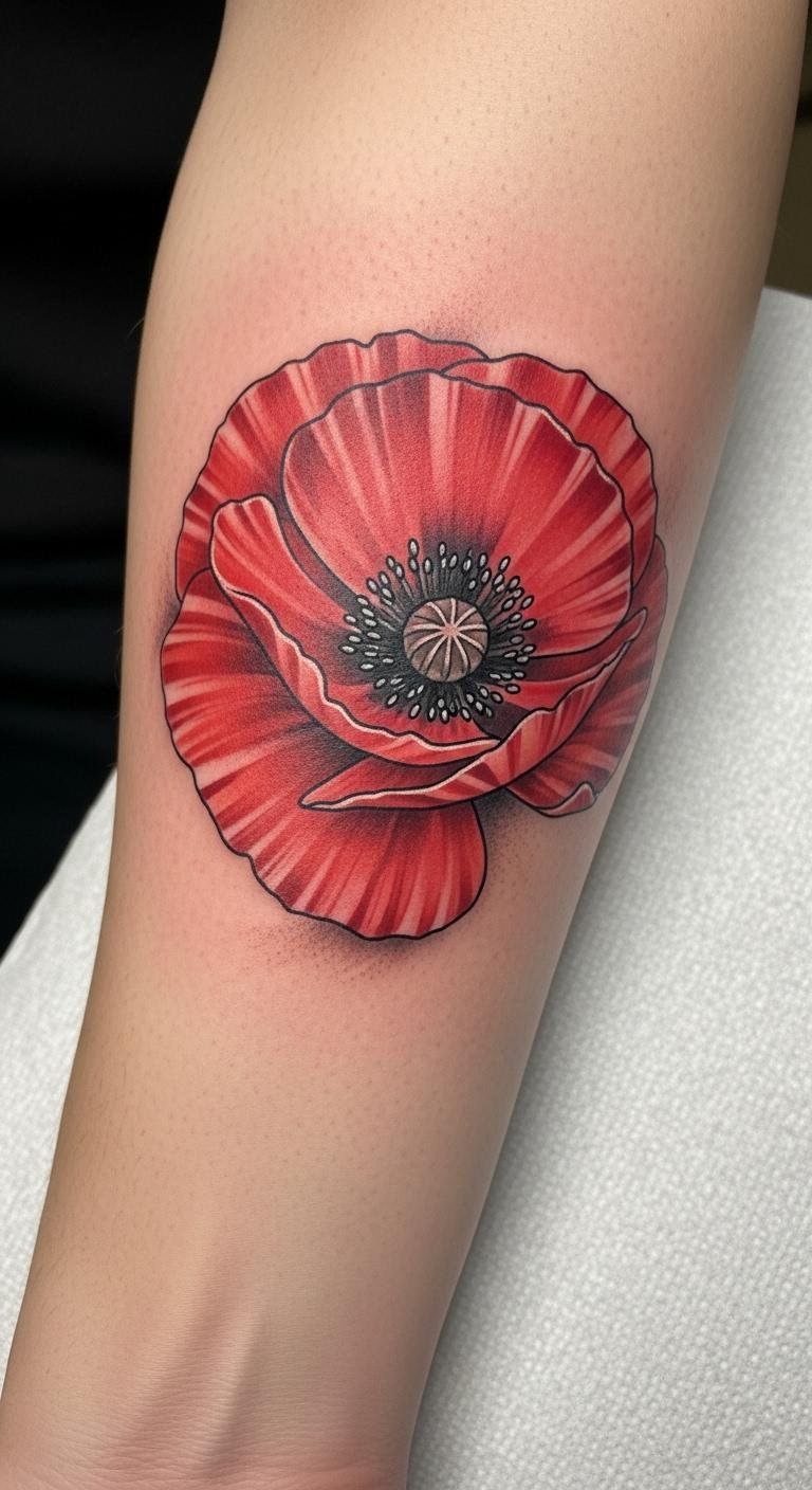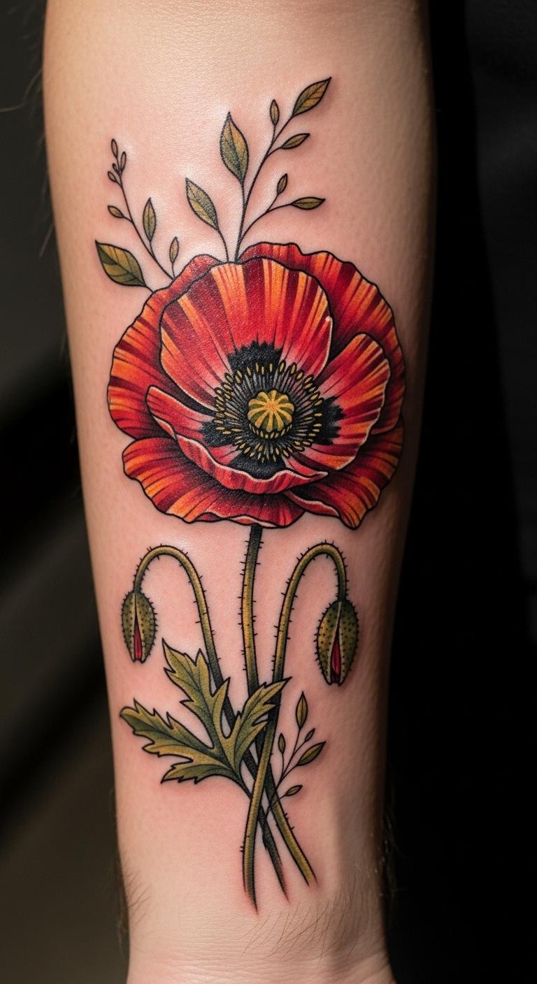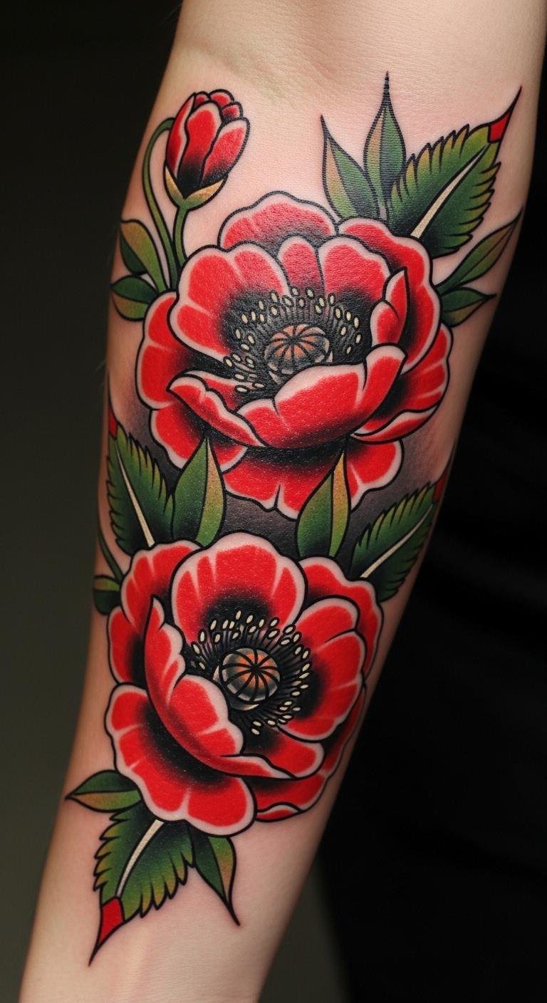 The bold traditional poppy tattoo symbolizes beauty, resilience, and a connection to cultural heritage. Placed on the forearm, it serves as a visible reminder of personal strength and the stories we carry.