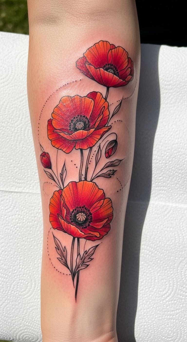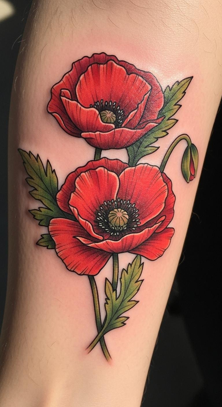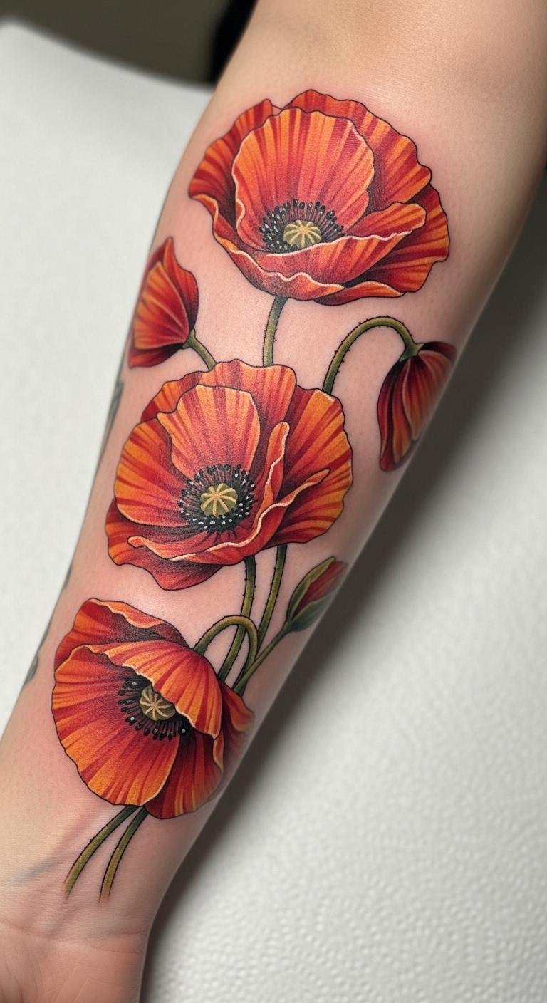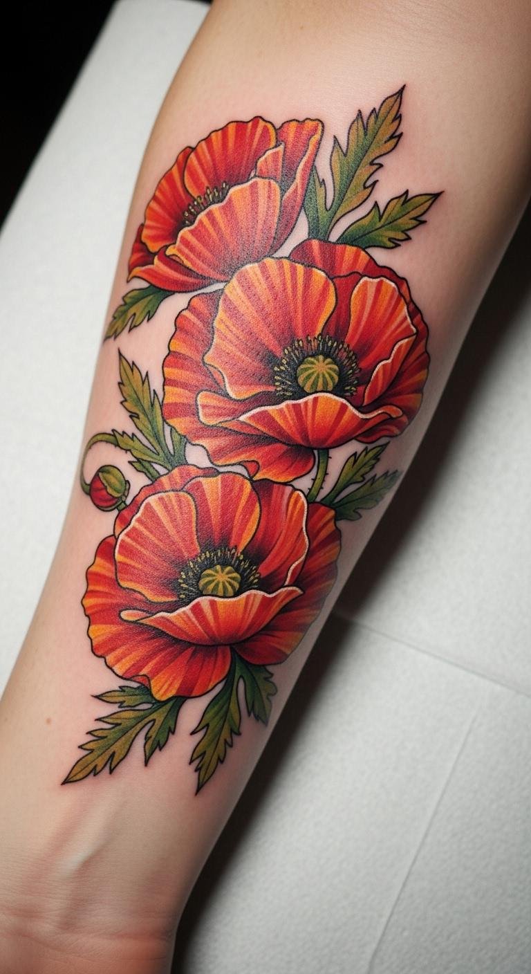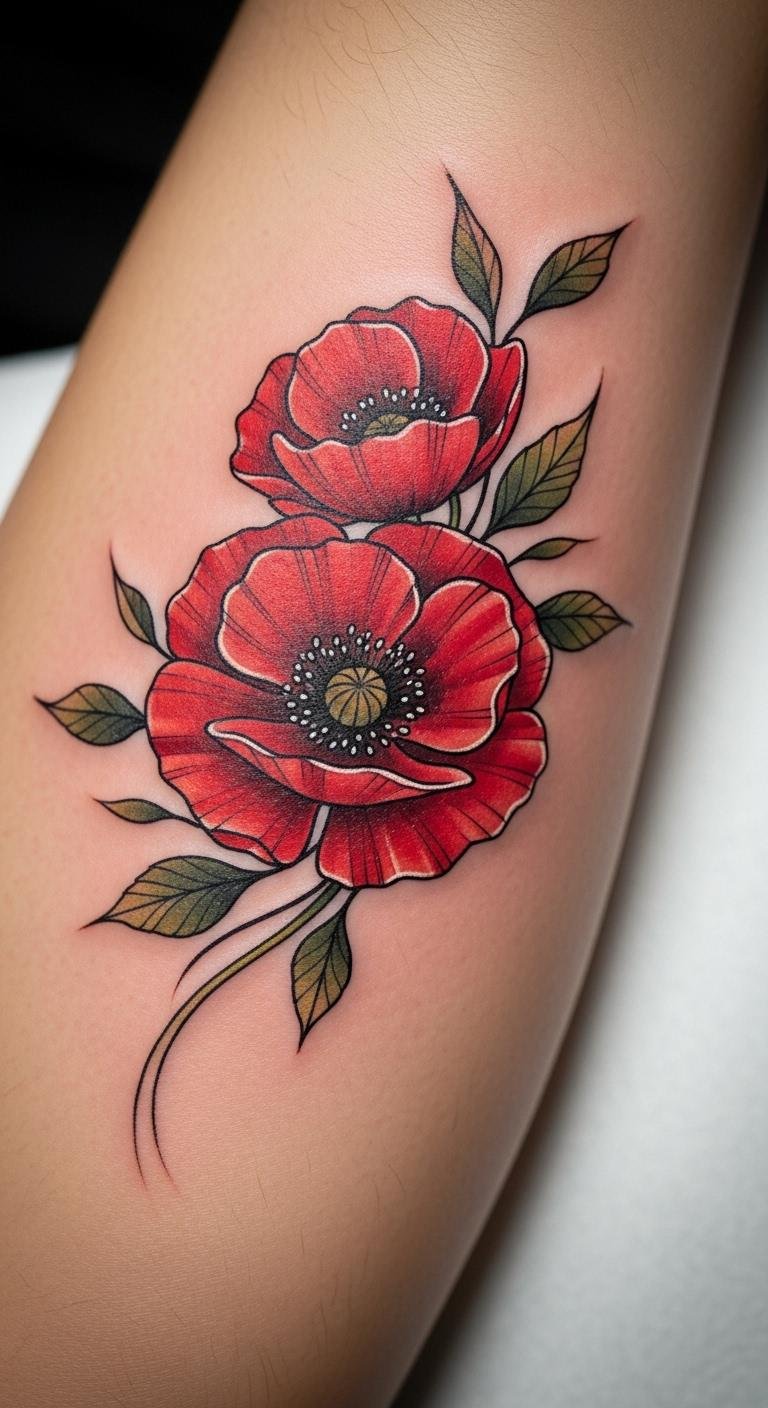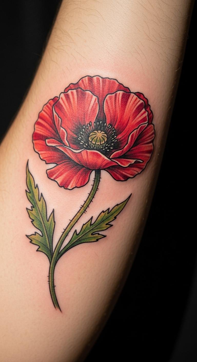 The bold traditional poppy tattoo symbolizes beauty, resilience, and a connection to cultural heritage. Placed on the forearm, it serves as a visible reminder of personal strength and the stories we carry.