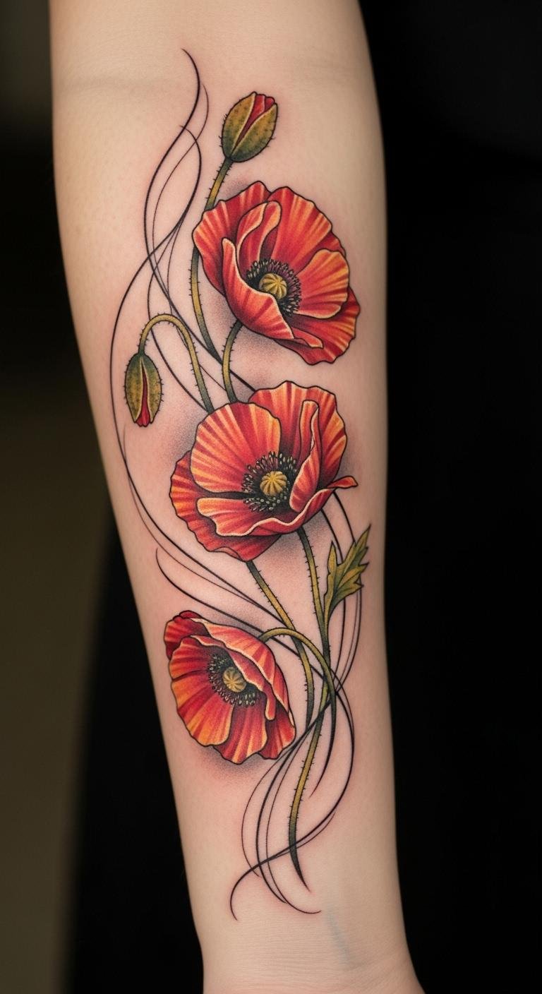 The poppy tattoo on the forearm serves as a poignant reminder of lost loved ones, embodying the fragility of life and the enduring spirit of those who’ve passed.