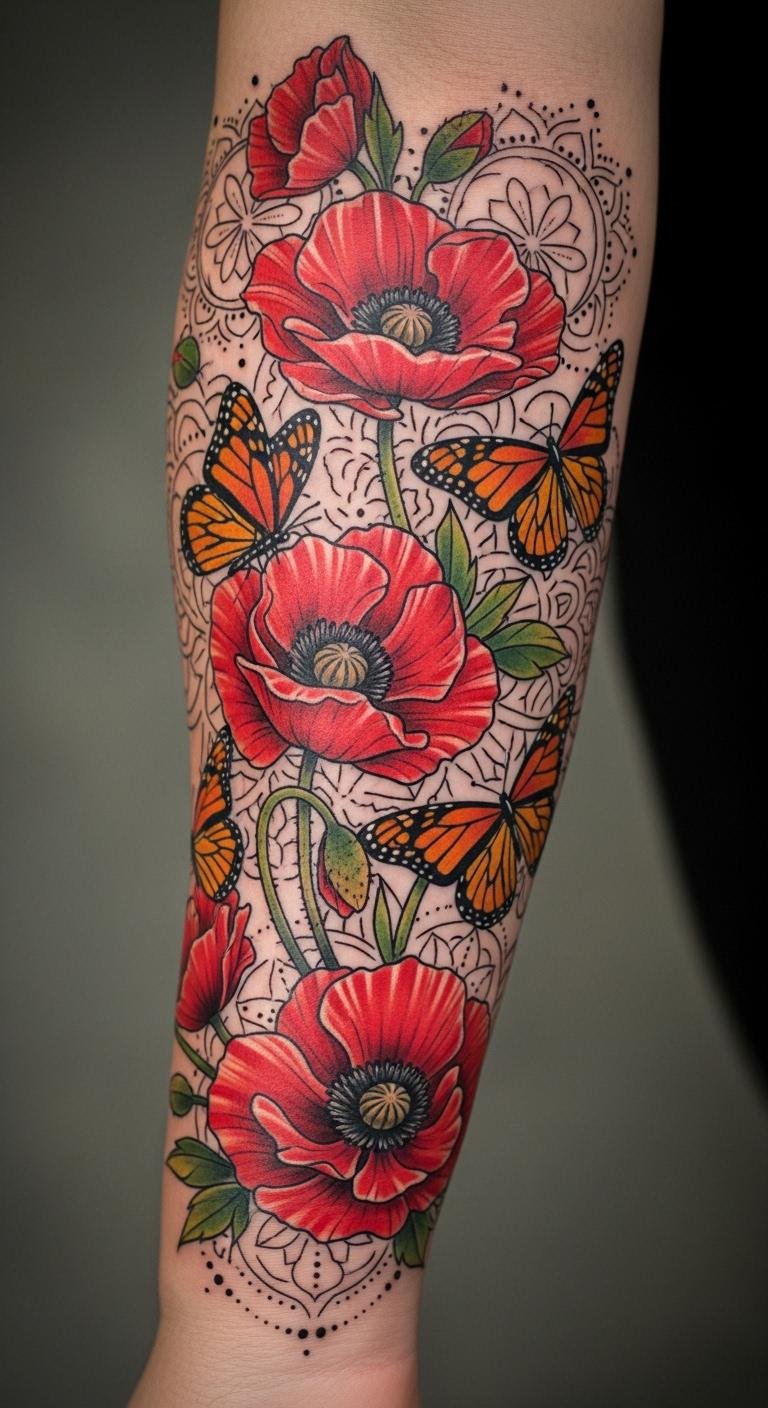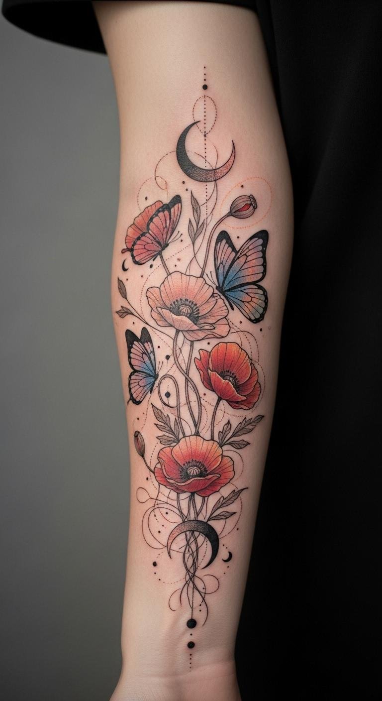 This tattoo symbolizes the transient beauty of life and the interconnectedness of nature. The poppies represent remembrance and the fragility of existence, while the butterflies signify transformation and hope.