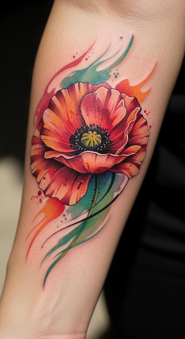 This watercolor poppy tattoo symbolizes beauty and resilience, representing the fleeting nature of life and the strength that comes from embracing impermanence.
