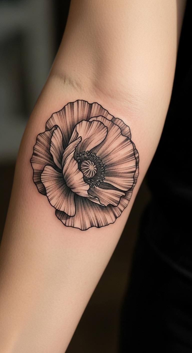 The Japanese poppy tattoo on the forearm symbolizes tranquility and transformation, inviting the observer to reflect on the fleeting beauty of life.