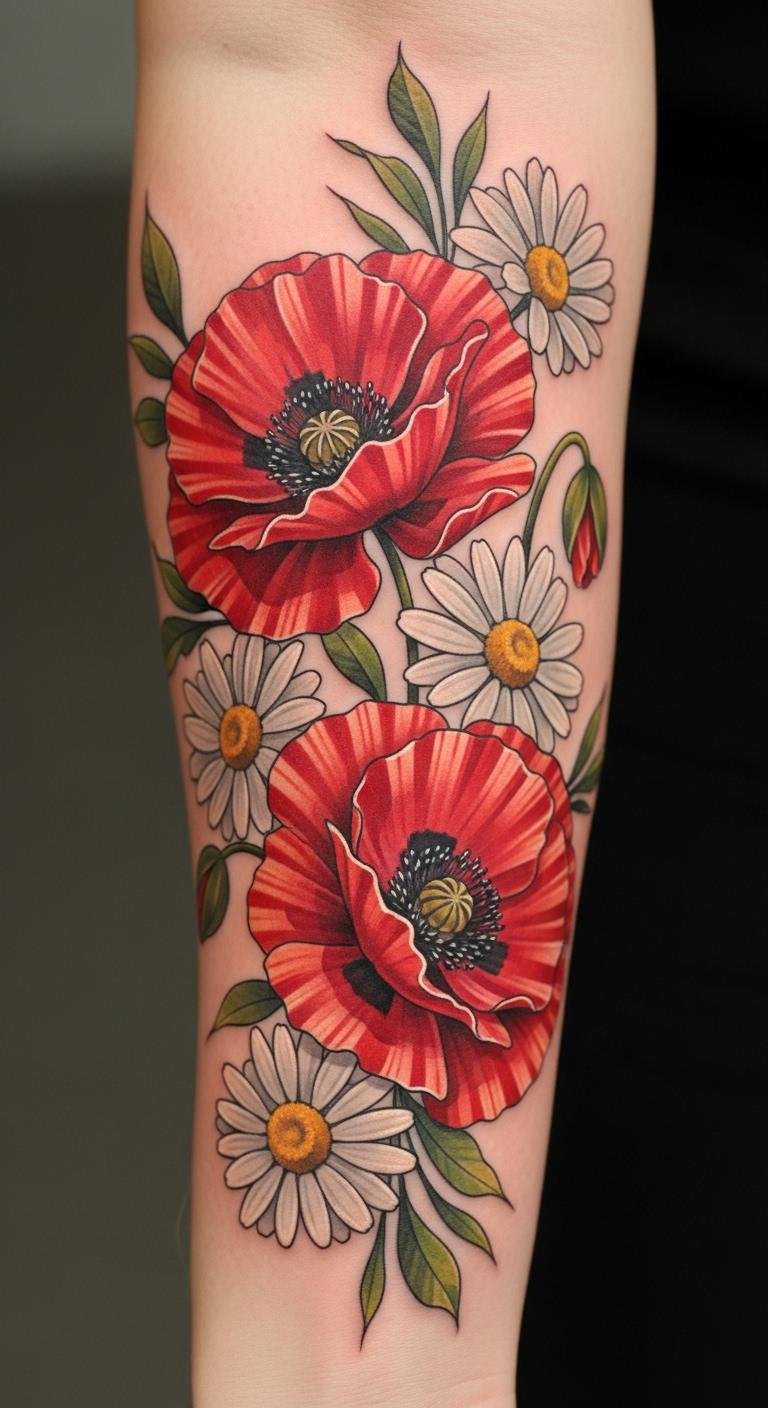 Poppies often represent remembrance and the fleeting nature of life, while daisies convey purity and innocence. Together, they create a dynamic representation of life’s contrasts: joy and sorrow, strength and vulnerability.