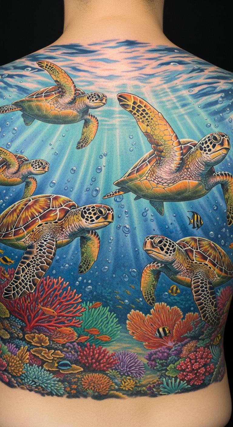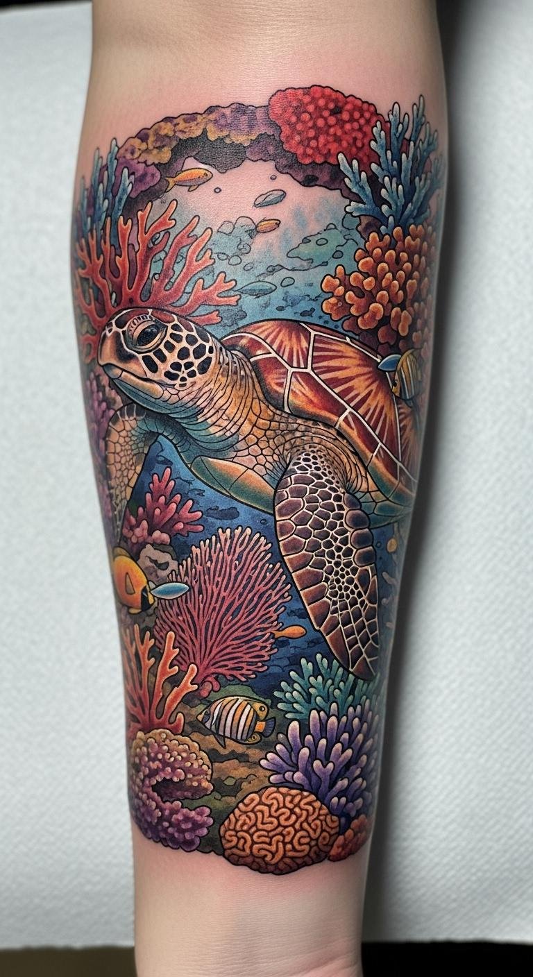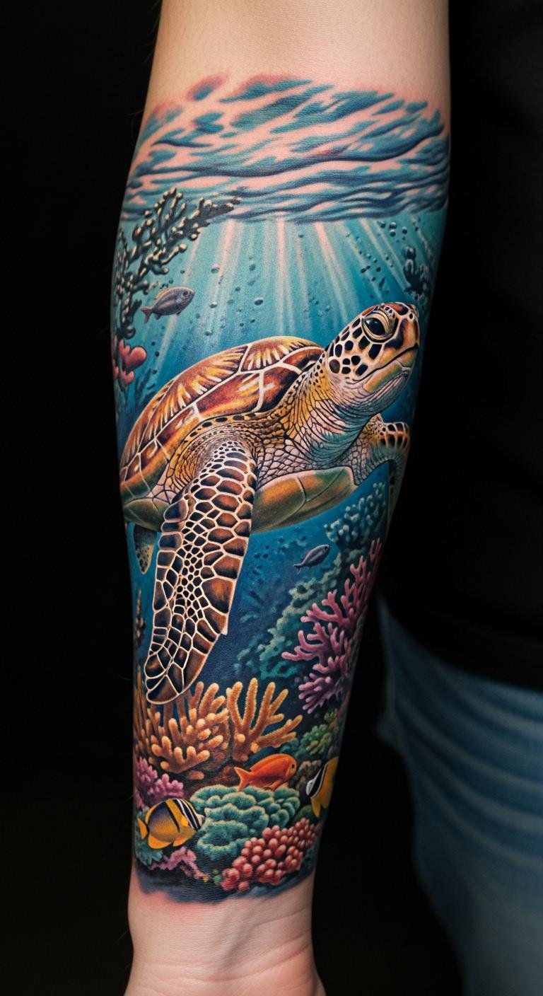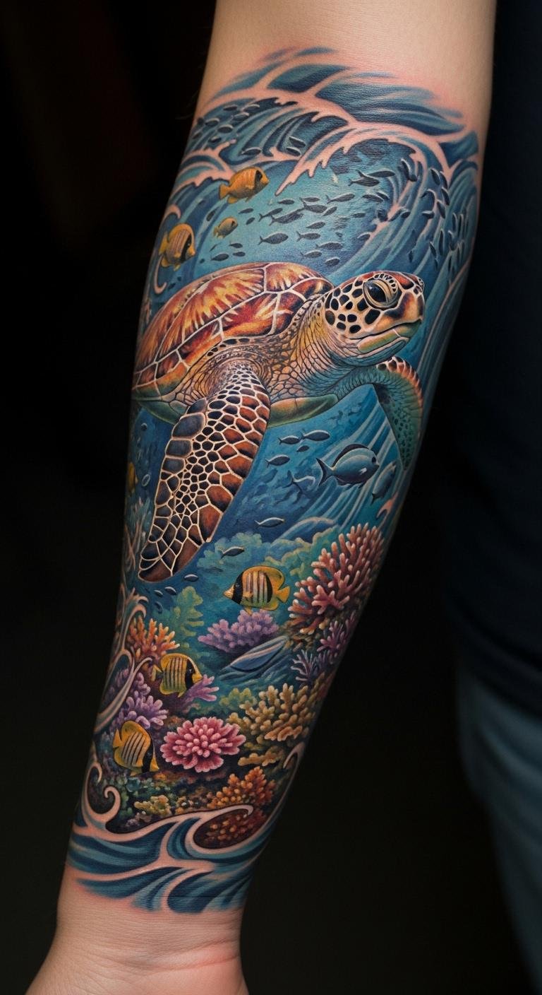 This tattoo symbolizes the beauty and fragility of marine ecosystems, representing not only the wonder of ocean life but also the importance of turtle conservation.