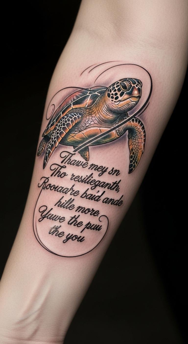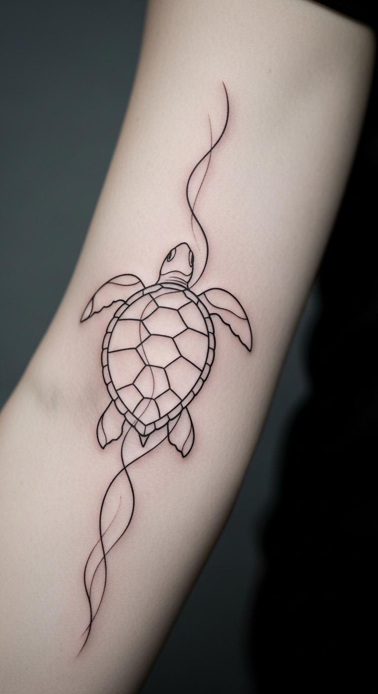 This tattoo, placed on the forearm, symbolizes tranquility and freedom, inviting the wearer to embrace life’s journey with resilience, much like a turtle navigating the ocean.