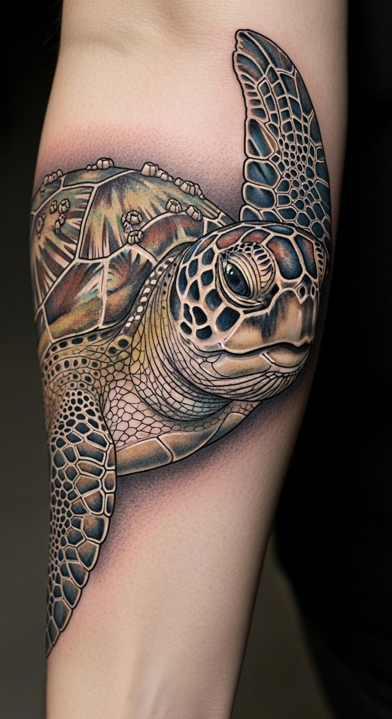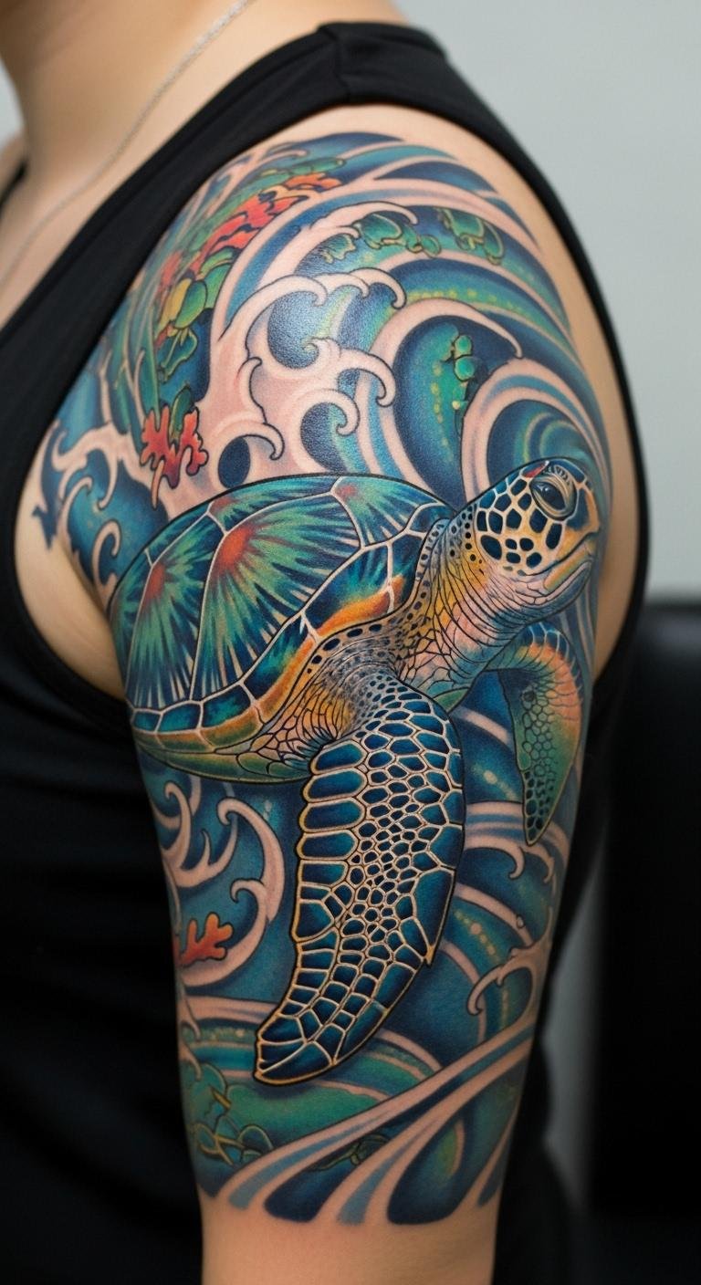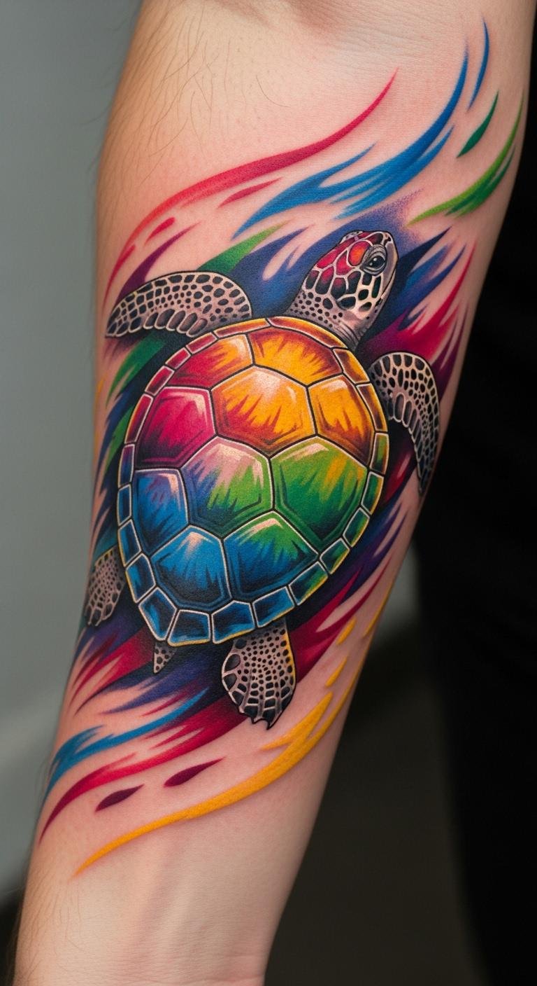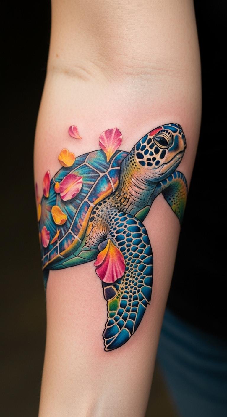 This tattoo symbolizes a deep connection to the ocean and the spirit of adventure. The colorful turtle represents resilience and exploration, embodying life’s fluid journey.