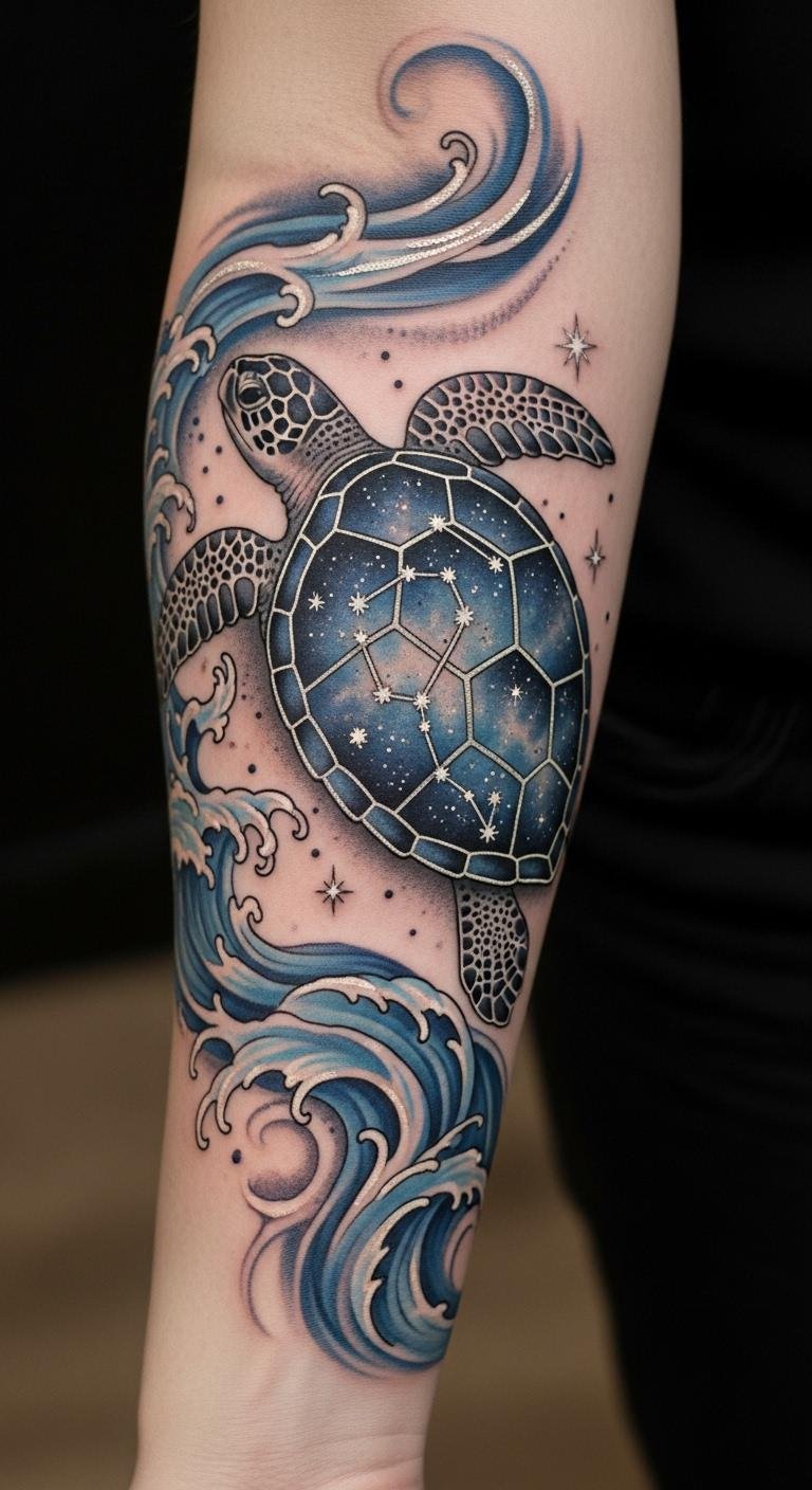 This tattoo symbolizes the deep connection between sea turtles and the night sky, reflecting their ancient navigation skills and the journey of personal growth.