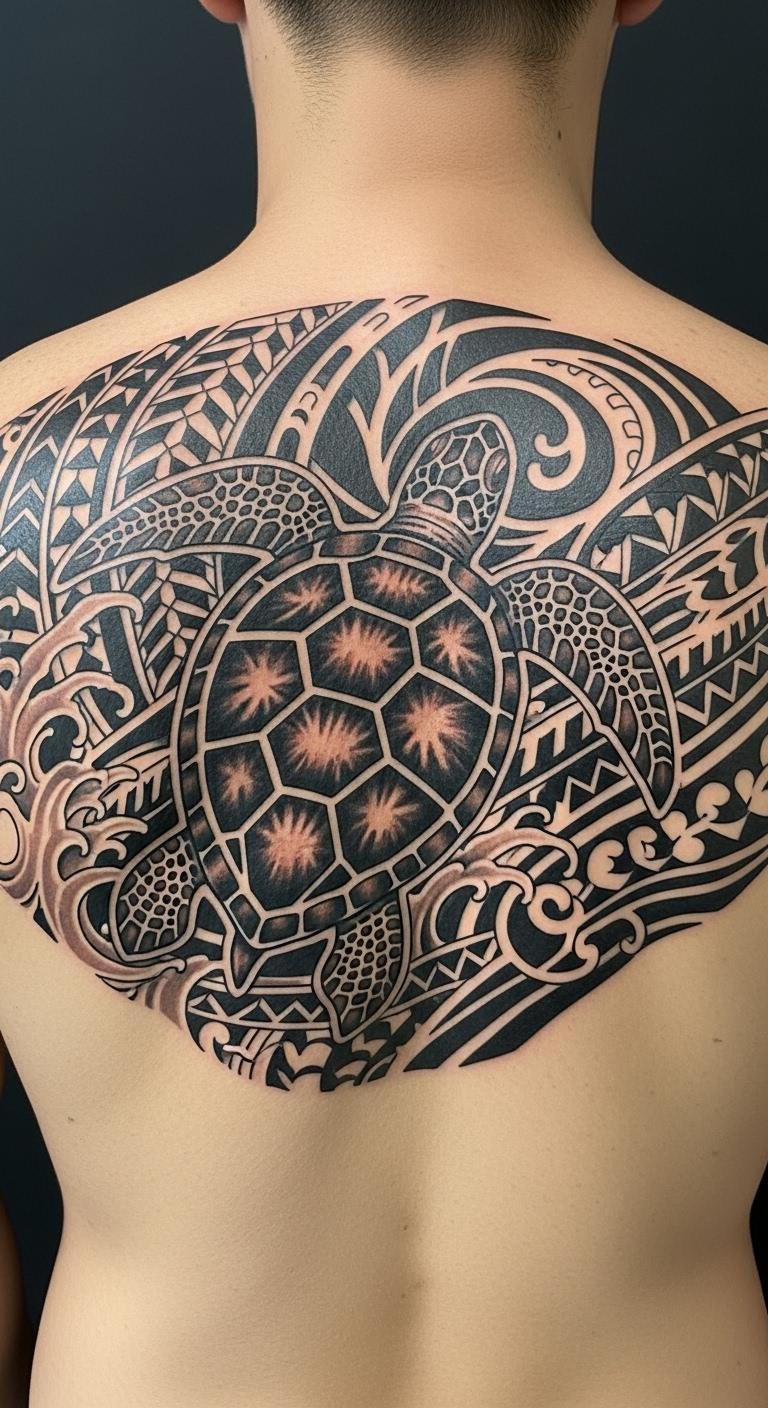 This tattoo embodies a profound connection to Polynesian culture, representing the strength and resilience of the turtle as well as the importance of ocean conservation.
