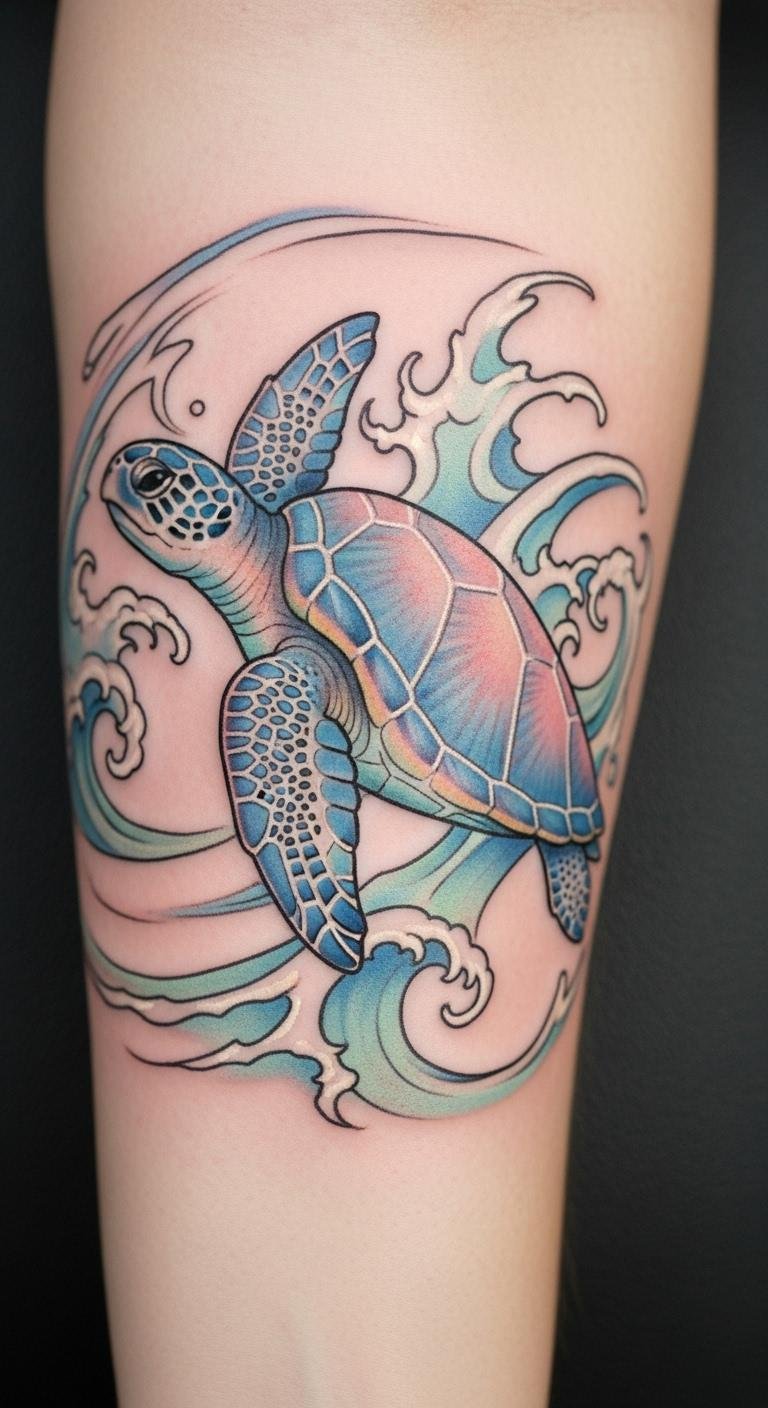 The soft pastel colors evoke a sense of calm, reflecting the wisdom and protection associated with turtles. Positioned here, the tattoo remains visible, serving as a constant reminder of the beauty in life’s ebb and flow.