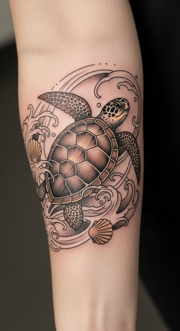 This tattoo symbolizes wisdom and protection, as the turtle is often seen as a guardian of the sea.