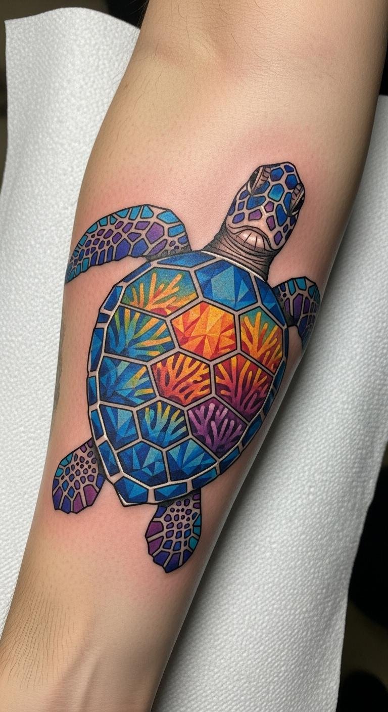 The geometric sea turtle tattoo symbolizes wisdom and longevity, embodying the spirit of freedom and connection to nature.