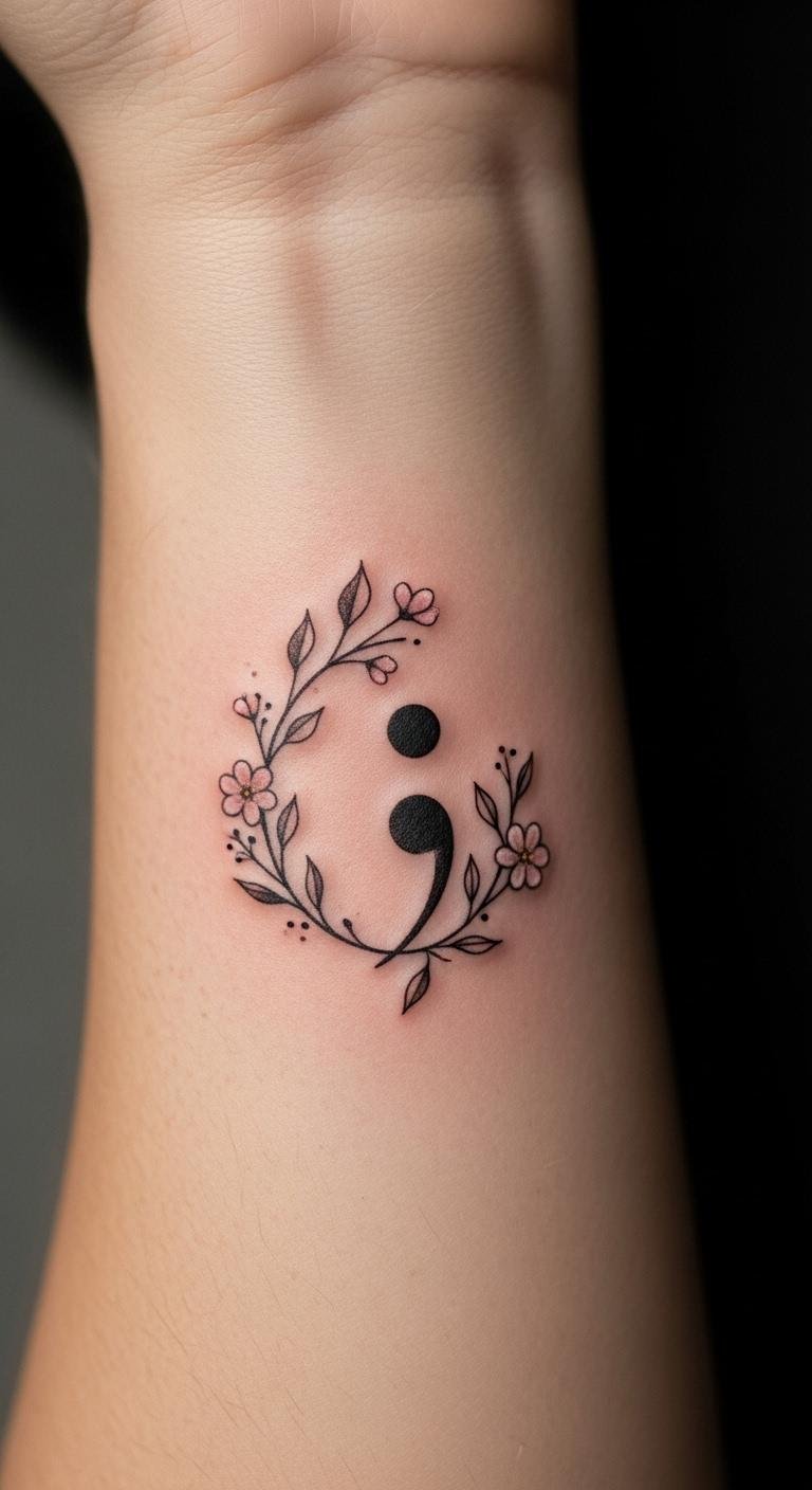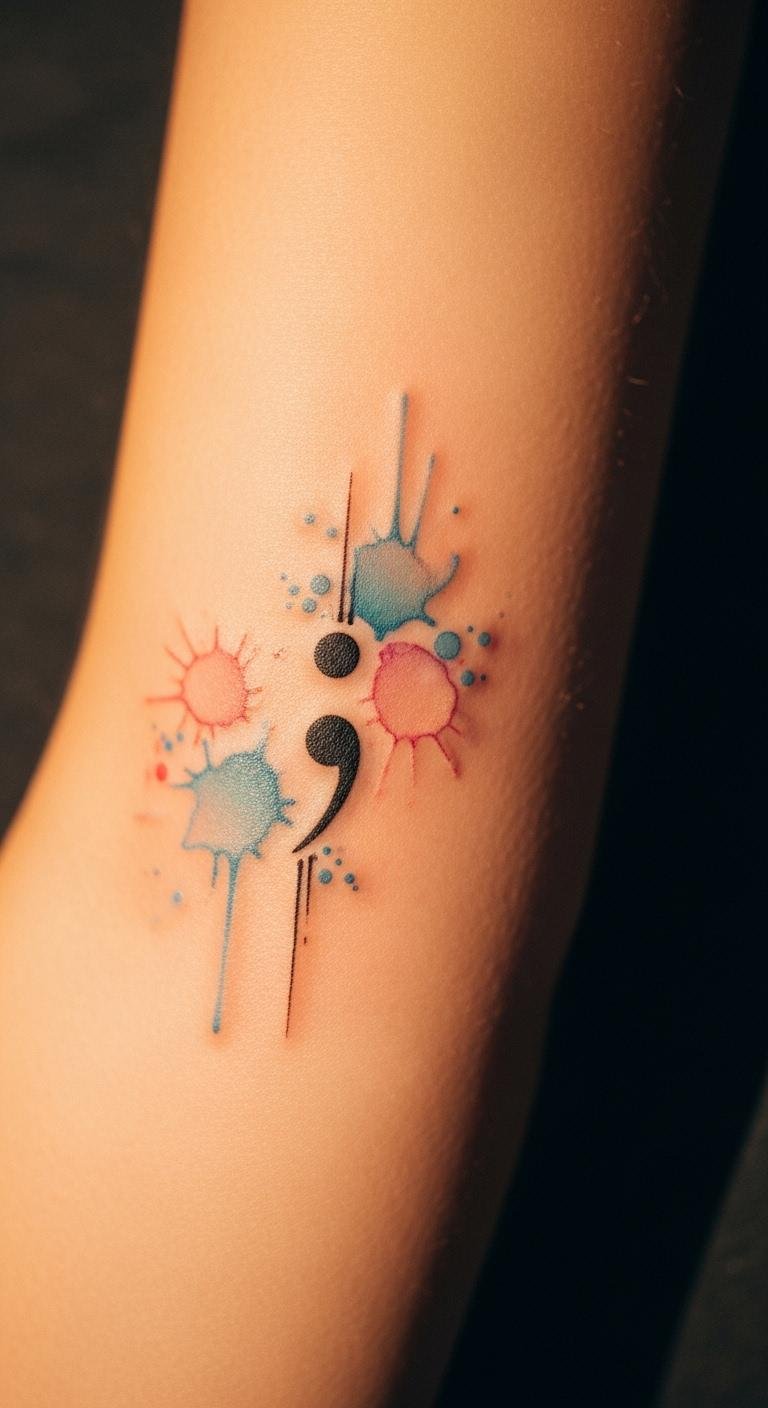 This tattoo represents the profound impact of Project Semicolon, symbolizing the continuation of one’s story despite struggles with mental health.