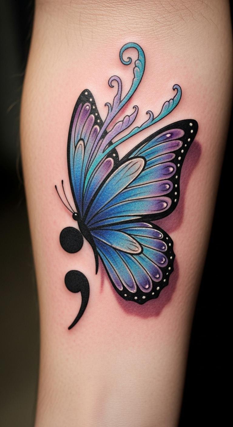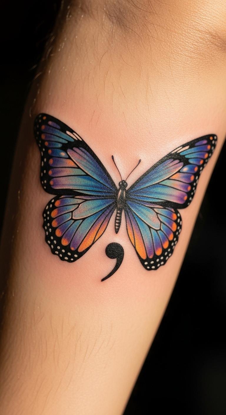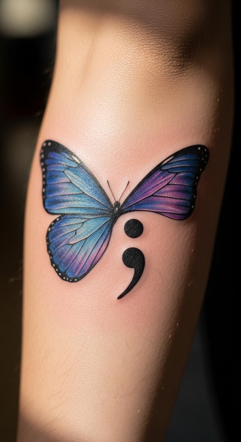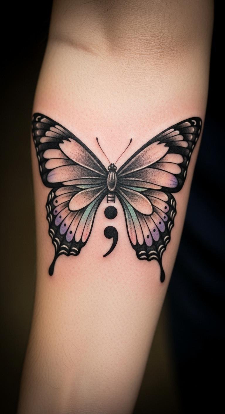This semicolon butterfly tattoo represents resilience and the journey of overcoming adversity.