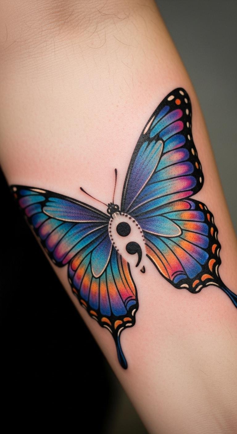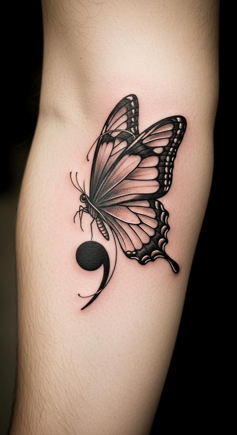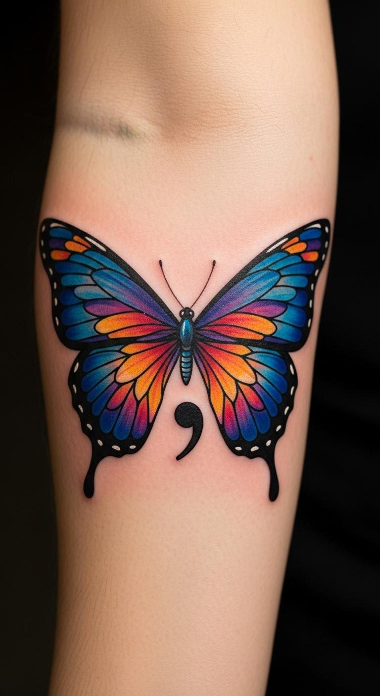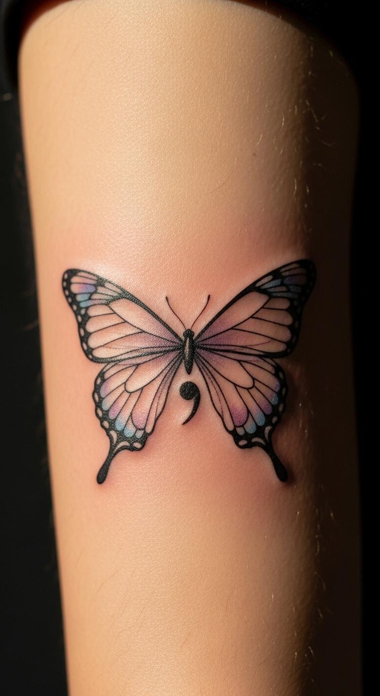 This semicolon butterfly tattoo represents resilience and the journey of overcoming adversity.