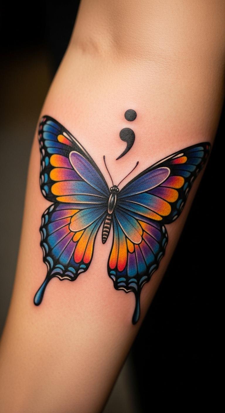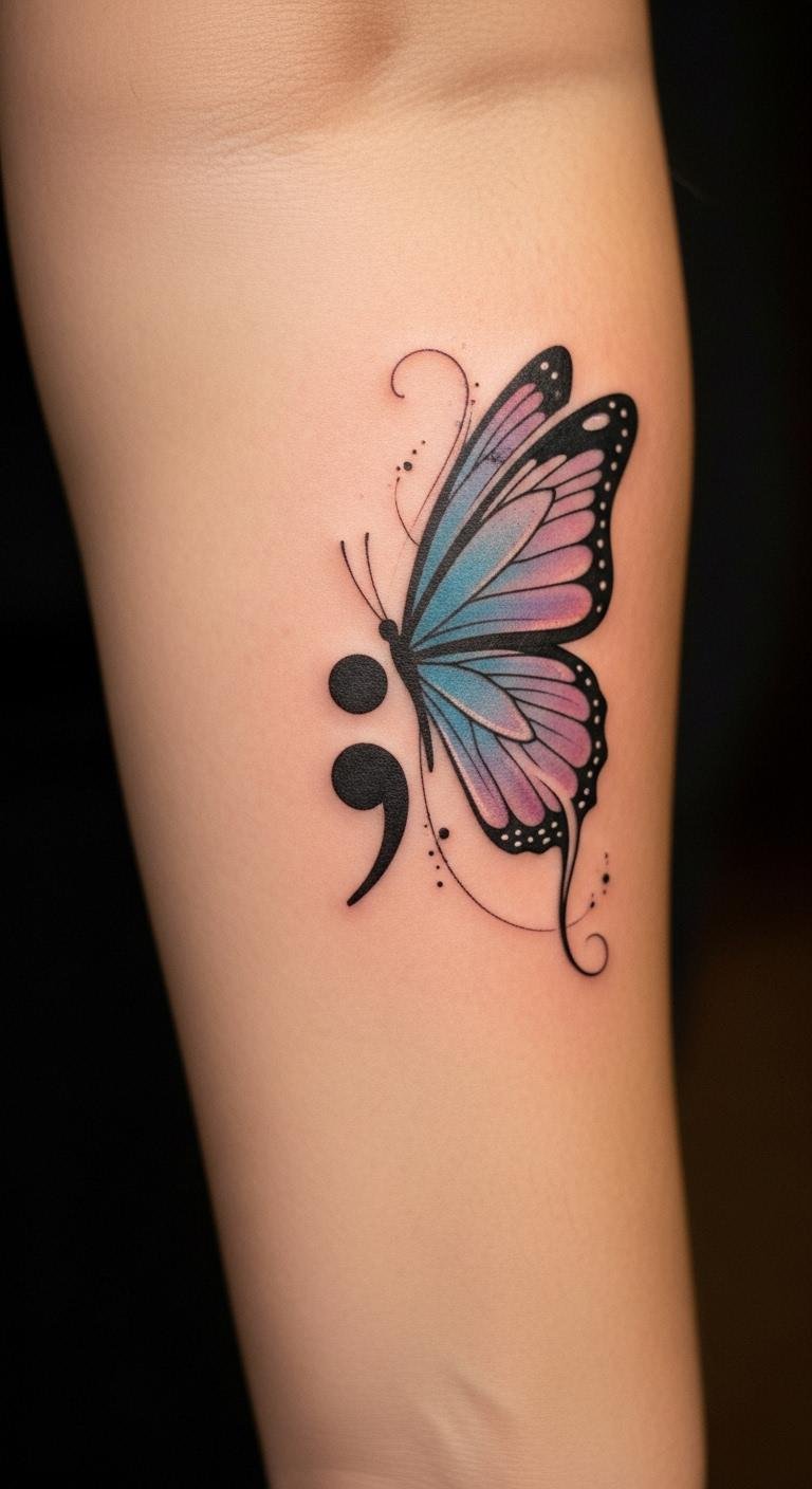 The semicolon butterfly tattoo on the forearm serves as a powerful reminder of personal journeys through mental health challenges. Its placement allows for visibility, fostering conversations about resilience and healing.