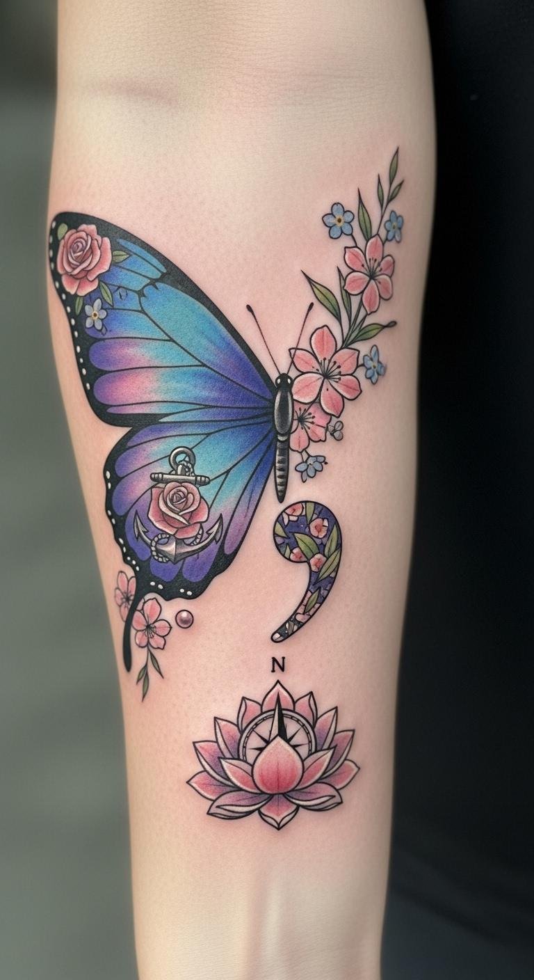 This tattoo symbolizes resilience and transformation, with the butterfly representing personal growth and freedom, while the semicolon signifies the continuation of one’s journey despite struggles.