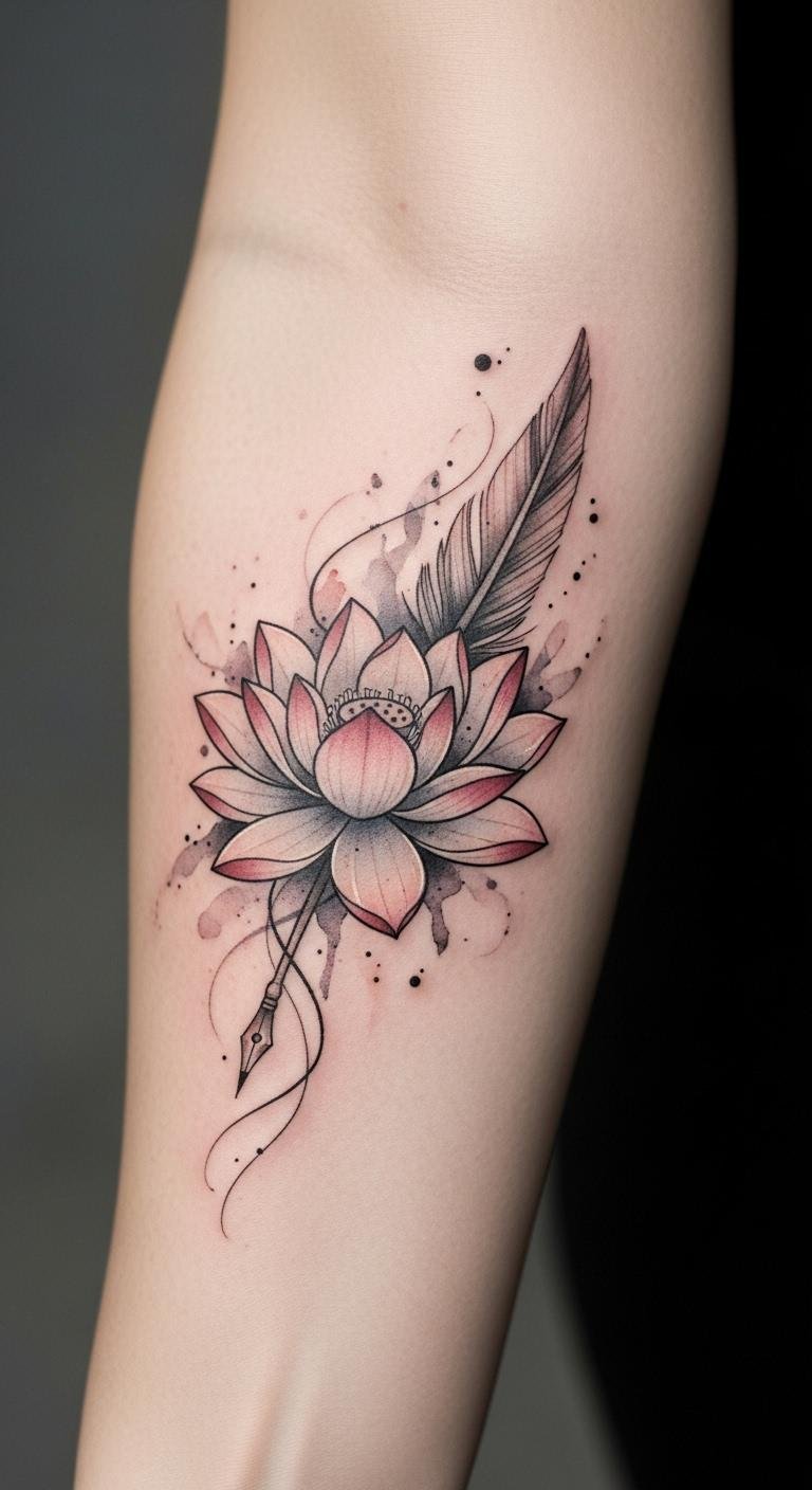 The lotus flower, often associated with purity and rebirth, signifies personal growth through challenges, while the quill embodies the healing power of expression and authenticity.