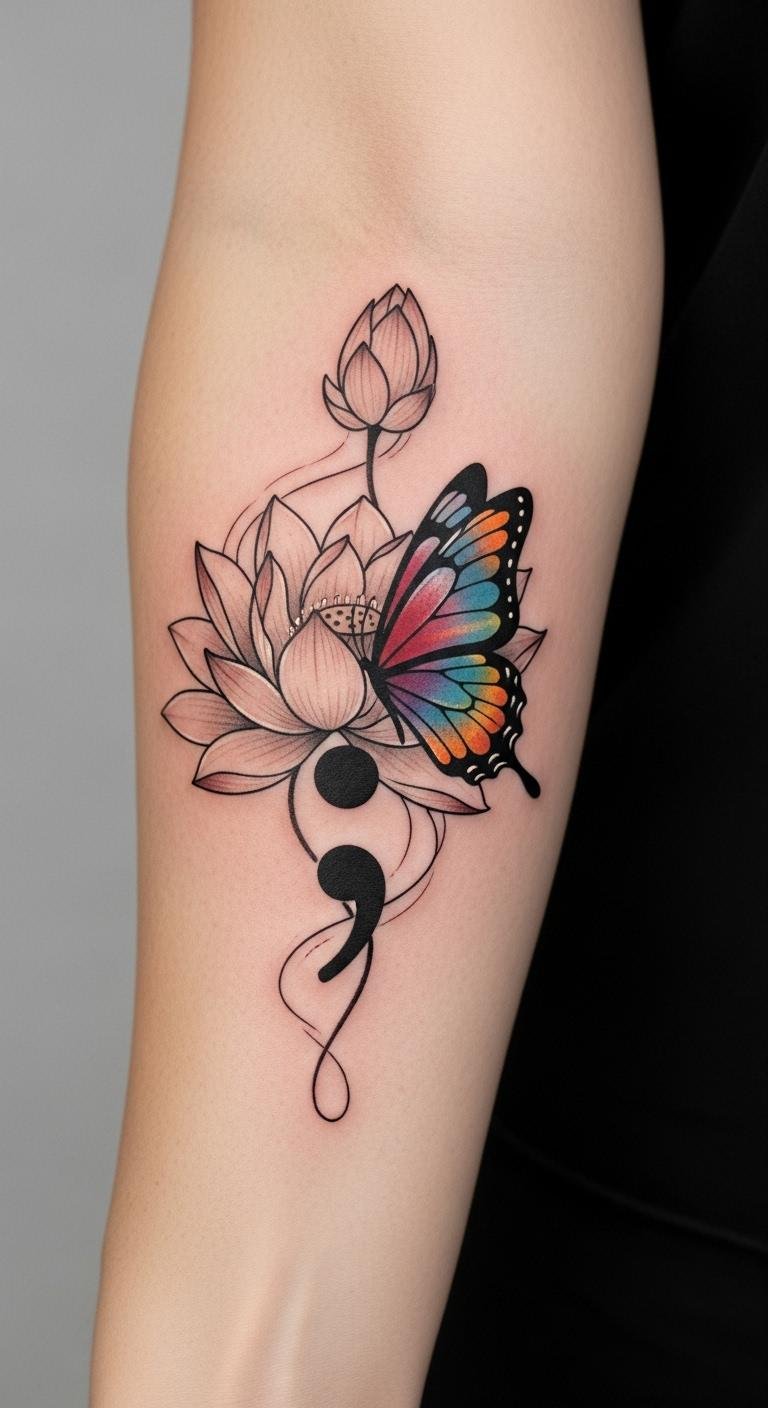 The lotus flower signifies the journey from adversity to beauty, while the semicolon butterfly reflects the choice to continue one’s story despite challenges.